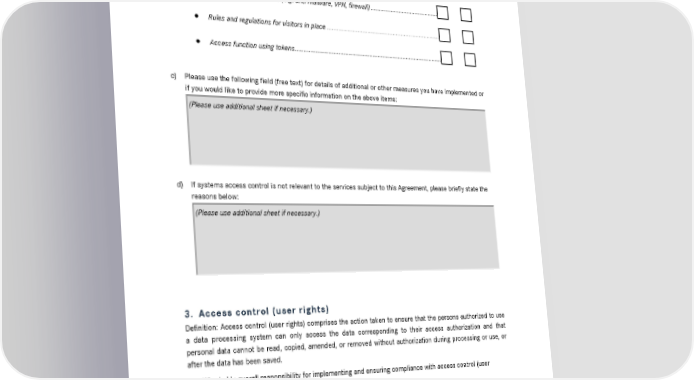 Contractual standards for Data Processing on Behalf, last revised December 8, 2014 • Access authority specified and checked ...................................................................... ☐ ☐ • Authentication procedure based on required level of protection for the information (classification) ............................................................................................................. ☐ ☐ • Appropriate password protection (binding requirements, encrypted storage) .............. ☐ ☐ • Special security software (e.g. anti-malware, VPN, firewall) ......................................... ☐ ☐ • Rules and regulations for visitors in place .................................................................... ☐ ☐ • Access function using tokens ....................................................................................... ☐ ☐ c) Please use the following field (free text) for details of additional or other measures you have implemented or if you would like to provide more specific information on the above items: (Please use additional sheet if necessary.) d) If systems access control is not relevant to the services subject to this Agreement, please briefly state the reasons below: (Please use additional sheet if necessary.) 3. Access control (user rights) Definition: Access control (user rights) comprises the action taken to ensure that the persons authorized to use a data processing system can only access the data corresponding to their access authorization and that personal data cannot be read, copied, amended, or removed without authorization during processing or use, or after the data has been saved. a) Who holds overall responsibility for implementing and ensuring compliance with access control (user rights)? Controller Processor Page 10 of 20