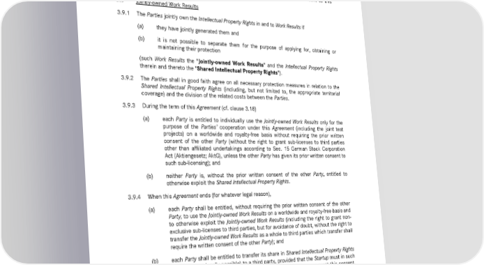 9 Startup adVANce | Cooperation Agreement 3.8.5 In addition to the rights of Daimler to the Work Results of the Startup as set forth in clause 3.8.4, Daimler shall be entitled to use these Work Results to the extent necessary to use and otherwise exploit the Jointly-owned Work Results pursuant to clause 3.9.4. 3.8.6 During the term of this Agreement (cf. clause 3.18), the Startup is not entitled to transfer its rights in and to its individually owned Work Results to a third party or to grant an exclusive license thereto for purposes similar to its similar to the Product Idea, the Concept and the Prototypes, respectively, if this adversely affects Daimler’s rights thereto pursuant to this Agreement. 3.9 Jointly-owned Work Results 3.9.1 The Parties jointly own the Intellectual Property Rights in and to Work Results if (a) they have jointly generated them and (b) it is not possible to separate them for the purpose of applying for, obtaining or maintaining their protection (such Work Results the "Jointly-owned Work Results" and the Intellectual Property Rights therein and thereto the "Shared Intellectual Property Rights"). 3.9.2 The Parties shall in good faith agree on all necessary protection measures in relation to the Shared Intellectual Property Rights (including, but not limited to, the appropriate territorial coverage) and the division of the related costs between the Parties. 3.9.3 During the term of this Agreement (cf. clause 3.18) (a) each Party is entitled to individually use the Jointly-owned Work Results only for the purpose of the Parties’ cooperation under this Agreement (including the joint test projects) on a worldwide and royalty-free basis without requiring the prior written consent of the other Party (without the right to grant sub-licenses to third parties other than affiliated undertakings according to Sec. 15 German Stock Corporation Act (Aktiengesetz; AktG), unless the other Party has given its prior written consent to such sub-licensing); and (b) neither Party is, without the prior written consent of the other Party, entitled to otherwise exploit the Shared Intellectual Property Rights. 3.9.4 When this Agreement ends (for whatever legal reason), (a) each Party shall be entitled, without requiring the prior written consent of the other Party, to use the Jointly-owned Work Results on a worldwide and royalty-free basis and to otherwise exploit the Jointly-owned Work Results (including the right to grant non- exclusive sub-licenses to third parties, but for avoidance of doubt, without the right to transfer the Jointly-owned Work Results as a whole to third parties which transfer shall require the written consent of the other Party); and (b) each Party shall be entitled to transfer its share in Shared Intellectual Property Rights (to the extent legally possible) to a third party, provided that the Startup must in such case obtain Daimler’s prior written consent; if Daimler refuses to grant this consent, Daimler is obligated to offer the Startup a fair and reasonable compensation; upon the payment of such fair and reasonable compensation, Daimler shall become the owner of the Startup’s share in the relevant Shared Intellectual Property Rights, which shall forthwith be Daimler’s sole Intellectual Property Rights. When requesting Daimler’s consent to the transfer of its share in Shared Intellectual Property Rights, the Startup shall provide Daimler with satisfactory evidence of a binding offer by the
