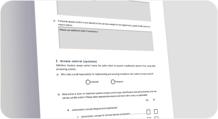 Contractual standards for Data Processing on Behalf, last revised December 8, 2014 o Security guards .............................................................................................. ☐ ☐ • Areas divided into different security zones ........................................................ ☐ ☐ d) Please use the following field (free text) for details of additional or other measures you have implemented or if you would like to provide more specific information on the above items: (Please use additional sheet if necessary.) e) If physical access control is not relevant to the services subject to this Agreement, please briefly state the reasons below: (Please use additional sheet if necessary.) 2. Access control (systems) Definition: Systems access control means the action taken to prevent unauthorized persons from using data processing systems. a) Who holds overall responsibility for implementing and ensuring compliance with systems access control? Controller Processor b) What action is taken to implement systems access control (user identification and authentication) and who carries out this action? (Please select appropriate answers and mark with a cross, as applicable) Co Pr • Authorization concept designed and implemented o Authorization concept for terminal devices (computers) ................................ ☐ ☐ o Authorization concept for systems ................................................................ ☐ ☐ • User identified and authorization verified ..................................................................... ☐ ☐ • User identity management system implemented .......................................................... ☐ ☐ • Access attempts monitored, including response to security issues .............................. ☐ ☐ Page 9 of 20