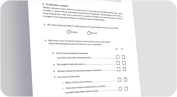 Contractual standards for Data Processing on Behalf, last revised December 8, 2014 d) If access control (user rights) is not relevant to the services subject to this Agreement, please briefly state the reasons below: (Please use additional sheet if necessary.) 4. Disclosure control Definition: Disclosure control refers to the action taken to ensure that personal data cannot be read, copied, amended, or removed without authorization during electronic transmission, during storage on data media, or during transit on such media, and to ensure that it is possible to establish and review the points at which it is envisaged it will be necessary to transfer personal data using data transfer facilities. a) Who holds overall responsibility for implementing and ensuring compliance with disclosure control? Controller Processor b) What action is taken to implement disclosure control and who carries out this action? (Please select appropriate answers and mark with a cross, as applicable) Co Pr • Forms of data forwarding fully documented (e.g. printout, data media, automated transfer) .......................................................... ☐ ☐ • Data recipients listed (enter under c)) .......................................................................... ☐ ☐ • Interfaces, retrieval and transmission programs documented ...................................... ☐ ☐ • For printouts and data media: o Regular inventory checks carried out ............................................................. ☐ ☐ o Transit security measures implemented (e.g. containers, encrypted storage media, handover records) ................................................. ☐ ☐ • For electronic forwarding: o Data transfer encrypted ................................................................................. ☐ ☐ o Data forwarding or transfer logged ................................................................ ☐ ☐ • Plausibility, completeness, and accuracy checks carried out ....................................... ☐ ☐ Page 12 of 20