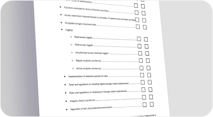 Contractual standards for Data Processing on Behalf, last revised December 8, 2014 b) What action is taken to implement access control (user rights) and who carries out this action? (Please select appropriate answers and mark with a cross, as applicable) Co Pr • Authorization and roles concept implemented for applications .................................... ☐ ☐ • Rules and regulations for authorizing users and data access implemented .................. ☐ ☐ • Regular review of authorizations .................................................................................. ☐ ☐ • Functions restricted (in terms of function and time)..................................................... ☐ ☐ • Access restrictions imposed (based on principles of need-to-know and least privilege) ☐ ☐ • Encrypted storage of personal data ............................................................................. ☐ ☐ • Logging o Read-access logged ....................................................................................... ☐ ☐ o Write-access logged ...................................................................................... ☐ ☐ o Unauthorized access attempts logged ........................................................... ☐ ☐ o Regular analyses carried out .......................................................................... ☐ ☐ o Ad hoc analyses carried out ........................................................................... ☐ ☐ • Implementation of retention periods for data .............................................................. ☐ ☐ • Rules and regulations on handling digital storage media implemented ......................... ☐ ☐ • Rules and regulations on disposing of storage media implemented ............................. ☐ ☐ • Integrity checks carried out .........................................................☐ ☐ • Separation of test and productive environment ............................................................ ☐ ☐ c) Please use the following field (free text) for details of additional or other measures you have implemented or if you would like to provide more specific information on the above items: (Please use additional sheet if necessary.) Page 11 of 20
