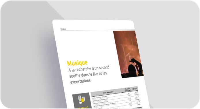Musique Musique À la recherche d’un second kgm^Ö]\Yfkd]live et les exportations Valeur économique Évolution CA 2013 2011-2013 Ventes de musique enregistrée -8 650 M€ Spectacle de musiques actuelles +10 1 219 M€ Spectacle de musique classique +14 1 401 M€ 8 Mds € Diffusion de musique (TV, radios, discothèques) -6 1 638 M€ Ventes à l’export +17 251 M€ Autres revenus des producteurs phonographiques -6 158 M€ et éditeurs de musique Revenus directs +2,8 5 317 M€ Marché des factures instrumentales et accessoires +9 615 M€ Vente de matériel audio +25 1 298 M€ Recettes de la presse musicale spécialisée -8 37 M€ Évolution revenus Droits d’auteur et droits voisins sur les marchés connexes +3 545 M€ 2011-2013 Contribution à la copie privée hors supports connectés -36 62 M€ +5,9% Revenus connexes +12,8 2 557 M€ TOTAL REVENUS +5,9% 7 874 M€ e 28 2 Panorama de l’économie de la culture et de la création en France