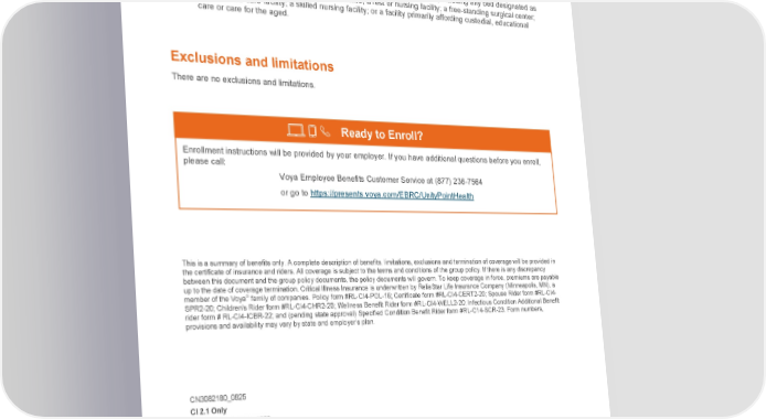 * Hospital means an institution that is run for the care and treatment of sick or injured persons as in-patients and which, on its premises or in facilities available to the Hospital on a pre-arranged basis, fully meets each of the following requirements: • It is operated in accordance with the laws pertaining to hospitals in the jurisdiction in which it is located; • It is under the supervision of a medical staff and has one or more Doctors available at all times; • It provides 24 hours a day service by registered graduate nurses (RNs); and • It is not an institution or any part of an institution used as: a hospice unit, including any bed designated as a hospice or a swing bed; a convalescent home; a rest or nursing facility; a free-standing surgical center; an extended-care facility; a skilled nursing facility; or a facility primarily affording custodial, educational care or care for the aged. Exclusions and limitations There are no exclusions and limitations. Ready to Enroll? Enrollment instructions will be provided by your employer. If you have additional questions before you enroll, please call: Voya Employee Benefits Customer Service at (877) 236-7564 or go to https://presents.voya.com/EBRC/UnityPointHealth This is a summary of benefits only. A complete description of benefits, limitations, exclusions and termination of coverage will be provided in the certificate of insurance and riders. All coverage is subject to the terms and conditions of the group policy. If there is any discrepancy between this document and the group policy documents, the policy documents will govern. To keep coverage in force, premiums are payable up to the date of coverage termination. Critical Illness Insurance is underwritten by ReliaStar Life Insurance Company (Minneapolis, MN), a ® member of the Voya family of companies. Policy form #RL-CI4-POL-16; Certificate form #RL-CI4-CERT2-20; Spouse Rider form #RL-CI4- SPR2-20; Children's Rider form #RL-CI4-CHR2-20; Wellness Benefit Rider form #RL-CI4-WELL2-20; Infectious Condition Additional Benefit rider form # RL-CI4-ICBR-22; and (pending state approval) Specified Condition Benefit Rider form #RL-C14-SCR-23. Form numbers, provisions and availability may vary by state and employer’s plan. CN3082180_0825 CI 2.1 Only Date Revised: 08/28/2023 213465-03152021