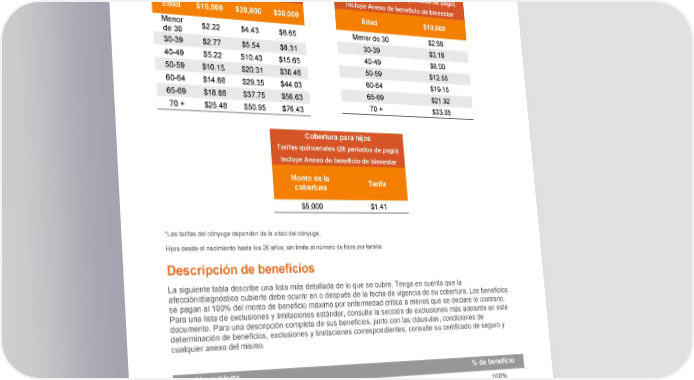 ¿Cuánto cuesta el seguro contra enfermedades críticas? La siguiente tabla muestra cuánto pagará por el seguro contra enfermedades críticas. Las tarifas dependen de su edad y la cantidad de cobertura seleccionada. Cobertura del empleado Cobertura para el cónyuge* Tarifas quincenales (26 periodos de pago) Tarifas quincenales (26 periodos de pago) Incluye Anexo de beneficio de bienestar Incluye Anexo de beneficio de bienestar Edad $10,000 $20,000 $30,000 Edad $10,000 Menor $2.22 $4.43 $6.65 Menor de 30 $2.68 de 30 30-39 $3.18 30-39 $2.77 $5.54 $8.31 40-49 $6.00 40-49 $5.22 $10.43 $15.65 50-59 $10.15 $20.31 $30.46 50-59 $12.55 60-64 $14.68 $29.35 $44.03 60-64 $19.15 65-69 $18.88 $37.75 $56.63 65-69 $21.92 70 + $25.48 $50.95 $76.43 70 + $33.05 Cobertura para hijos Tarifas quincenales (26 periodos de pago) Incluye Anexo de beneficio de bienestar Monto de la Tarifa cobertura $5,000 $1.41 *Las tarifas del cónyuge dependen de la edad del cónyuge. Hijos desde el nacimiento hasta los 26 años; sin límite al número de hijos por familia. Descripción de beneficios La siguiente tabla describe una lista más detallada de lo que se cubre. Tenga en cuenta que la afección/diagnóstico cubierto debe ocurrir en o después de la fecha de vigencia de su cobertura. Los beneficios se pagan al 100% del monto de beneficio máximo por enfermedad crítica a menos que se declare lo contrario. Para una lista de exclusiones y limitaciones estándar, consulte la sección de exclusiones más adelante en este documento. Para una descripción completa de sus beneficios, junto con las cláusulas, condiciones de determinación de beneficios, exclusiones y limitaciones correspondientes, consulte su certificado de seguro y cualquier anexo del mismo. Afección cubierta % de beneficio Ataque cardíaco* 100% Cáncer 100% Accidente cerebrovascular 100% Paro cardíaco repentino 25%