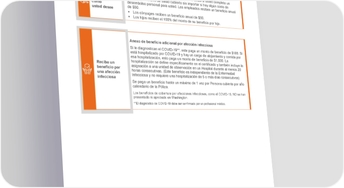 ¿Qué más se incluye? El seguro contra enfermedades críticas disponible a través de su empleador incluye los siguientes beneficios adicionales: Beneficio de bienestar Reciba $50 El beneficio de bienestar provee un beneficio anual si usted completa un para usar examen preventivo de salud cubierto sin importar si hay algún costo de como desembolso personal para usted. Los empleados reciben un beneficio anual usted desee de $50. Los cónyuges reciben un beneficio anual de $50. Los hijos reciben el 100% del monto de su beneficio por hijo. Anexo de beneficio adicional por afección infecciosa Si le diagnostican el COVID-19**, este paga un monto de beneficio de $100. Si está hospitalizado por COVID-19 y hay un cargo de alojamiento y comida por esa hospitalización, esto paga un monto de beneficio de $1,000. La Reciba un hospitalización se define específicamente en el certificado y también incluye la beneficio por asignación a una unidad de observación en un Hospital durante al menos 20 una afección horas consecutivas. (Este beneficio es independiente de la Enfermedad infecciosa Infecciosa y no requiere una hospitalización de 5 o más días consecutivos) Se paga un beneficio hasta un máximo de 1 vez por Persona cubierta por año calendario de la Póliza. Los beneficios de cobertura por afecciones infecciosas, como el COVID-19, NO se han presentado ni aprobado en Washington. **El diagnóstico de COVID-19 debe ser confirmado por un profesional médico.