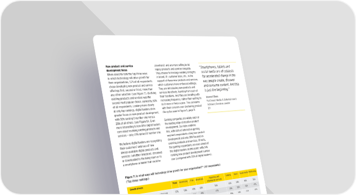Neˆ product and erice any‚hereš and are more ‚illing to let “ …martphones€ tablets and deeopŠent ‹ocu legacy products and services languishŠ Žhen asŒed to ranŒ the top three ‚ays They choose to leverage eisting strengths social media are all catalysts in ‚hich technology ‚ill drive gro‚th or in brand€ I£€ customer base€ etcŠ€ in the for accelerated change in the their organiœations€ „¨” o all respondents support o these ne‚ products and services€ way people create€ discoer chose developing ne‚ product and service ‚hich customers have embraced ‚illinglyŠ and consume content. †nd this oerings first€ second or third€ more than They are introducing ne‚ products and any other selection ˜see Figure ¨šŠ Evolving services iteratively€ learning rom each o is ‡ust the beginning.” eisting products and services ‚as the their iterationsŠ And they are iterating ‚ith second most popular choice€ ranŒed by „…” increasing reuency€ rather than ‚aiting to Hoˆard a o all respondentsŠ LooŒing more closely do it once or t‚ice a yearŠ This correlates •ortheast Media & Entertainment at only top ranŒings€ digital leaders sho‚ ‚ith their concern over shortening product ƒdisory Serices Leader greater ocus on ne‚ product development€ lie cycles seen in Figure „€ page “Š EY ‚ith ‰…” ranŒing it number one versus ‡„” o all others ˜see Figure žšŠ Even Gaming companies are ‚idely seen at more interesting is ho‚ little digital leaders the leading edge o iterative product care about evolving eisting products and developmentŠ ƒur data confirms services — only ˆ“” ranŒed it number oneŠ this€ ‚ith ™™” o interactive gaming segment respondents citing ne‚ product Že believe digital leaders are recogniœing development and only ‰“” ocused on their customers’ embrace o ne‚ evolving products and servicesŠ ƒ note€ al‚aysavailable digital products and the gaming respondents are even ahead o services ˜‚hether broadcast€ streamed the digital leaders on this point€ ‚ith ‰¥” or do‚nloaded to the living room or to ranŒing ne‚ product development number a smartphone or tablet that could be one ˜compared ‚ith ‰…” o digital leadersšŠ Figure Œ: “n hat ays ill technology drie groth for your organiation…¦ ¤ƒll respondents¥ (Top three rankings) roˆth drier †ota Advertising Film ›roadcast £ublishing and Gaming Music ocial media Technology inormation services ¦evelop ne‚ products¯service oerings „¨” „¥” ¥“” ™…” „™” ™™” ™¥” ¥“” „™” Evolve eisting products¯service oerings „…” ™“” „ˆ” ¥“” ¥¨” ‰“” „‡” ¥‰” ¥¨” Get to marŒet aster ‚ith ne‚ or evolved ¥…” ‰ˆ” ¥‡” ‰ž” ‰‡” „„” ‰¥” ¥ˆ” ¥ˆ” products¯services ¡£ercentages sho‚n represent all respondents ‚ho ranŒed each choice first€ second or thirdŠ Figure 8: “n hat ays ill technology drie groth for your organiation…¦ (Top rank only) Develop new products/ 30% service offerings 25% Evolve existing products/ 19% service offerings 30% Get to market faster with 13% new or evolved products/services 12% Digital Leaders All others ¡£ercentages sho‚n represent respondents ‚ho ranŒed each choice number oneŠ §§
