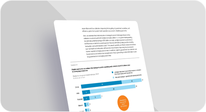 expenditure and tax collection, improving the targeting of government subsidies, and efficiency gains from government operations as a result of digitizing payments. First, we estimate that total reduction in leakage in government expenditure and tax collection could amount to $110 billion annually (Exhibit 17). For government spending, we estimate potential savings of $70 billion annually, as digital payments could reduce inefficiencies endemic to current payment flows by eliminating leakage and by lowering 65 transaction and administrative costs. As a result, spending on infrastructure and services such as health and education will become more effective, improving the physical and human capital in emerging economies. In addition, digitizing government tax collection can boost revenue and reduce tax receipts lost to fraud, generating a further $40 billion a year for governments in emerging economies. Exhibit 17 Digital payments can reduce the leakage in public spending and collection by $110 billion a year in emerging economies 1 Leakage reduction in government revenue collection Reduction in government leakage, 2014 (from businesses and consumers) $ billion per annum Reduced leakage in government subsidy payments China 18 10 27 India 3 20 24 Pakistan 2 5 7 Mexico 1 1 2 Developing economies Nigeria 1 1 2 total = $110 billion Brazil 0 1 1 Ethiopia <1 1 Calculations based on 2014 baseline values. NOTE: Numbers may not sum due to rounding. SOURCE: McKinsey Global Institute analysis Second, there are large potential gains from better targeting of subsidies, such as those for staple foods and fuel. As discussed earlier, these programs are a popular form of social welfare in many economies, but they are subject to the risk of fraud and theft and they also disproportionately benefit wealthier households with greater purchasing power. Countries with strong digital financial inclusion could replace cash-based social payments and subsidy programs with targeted, direct payments. This would drive significant costs savings and reduce theft while simultaneously improving the social outcomes by better targeting spending to its intended beneficiaries—the poor. 65 Inclusive growth and financial security: The benefits of e-payments to Indian society, McKinsey & Company, October 2010. McKinsey Global Institute Digital finance for all: Powering inclusive growth in emerging economies 49