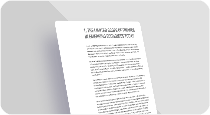 1. THE LIMITED SCOPE OF FINANCE IN EMERGING ECONOMIES TODAY A well-functioning financial-services sector is critical to the economic health of a country, allowing people to save for and insure against expected and unexpected events, enabling entrepreneurs and businesses to invest in new and productive businesses and to manage their supply chains, and making it possible for individuals, businesses, governments, and financial-services providers to conduct transactions efficiently. However, individuals and businesses in emerging economies do not have the same access to financial services enjoyed by their counterparts in advanced economies. Two billion people, or 45 percent of the developing world’s adult population, lack an account with a bank, other financial institution, or mobile-money service. In addition, 200 million MSMEs, or half of all such businesses in emerging economies, lack sufficient access to the credit they need to thrive.24 The problem of financial exclusion goes far beyond the poor—the majority of the developing world’s consuming or middle class are also underserved. Those who do use financial services face significant inefficiencies, leading to high prices and limiting their access to the broad range of savings, credit, and insurance products that is commonplace in advanced economies. Where good formal options do not exist, individuals and businesses must resort to cash and the informal financial system with high costs and greater risks—both to themselves and to society at large—or forgo business opportunities entirely. Financial institutions and governments also lose. Heavy use of cash—93 percent of all transactions across emerging economies are conducted in cash compared with 50 percent in developed economies—raises costs for providers and deters them from serving millions of less wealthy customers and smaller companies. For example, more than 99 percent of transactions by volume in Ethiopia, India, Nigeria, and Pakistan are in cash, with buyers using cash for everything from real estate transactions to vehicle registration. Similarly 94 percent of all transactions in China remain in cash.25 For governments, cash-based payment systems create a leaky pipeline for expenditure and tax collection; in some cases, 26 nearly one-third of such payments can be lost to corruption. THE FINANCIAL NEEDS OF MOST INDIVIDUALS IN EMERGING ECONOMIES ARE NOT BEING MET A significant share of people in emerging economies are simply not part of the financial 2B system, and an even larger number of adults do not use a full suite of financial services people lack a such as investment products, lines of credit, mortgage loans, and insurance. Limitations financial account in financial access are particularly acute among women, people living in rural areas, and in emerging those who are less well off. However, even wealthier people in emerging economies transact economies more in cash, save more in hard assets, and borrow less from formal sources than do their counterparts in advanced economies. Difficult access, limited product choice, and high prices and other intangible costs such as travel time all are to blame. The resulting financial exclusion imposes costs and means that opportunities are lost. 24 We drew on a number of sources to arrive at these estimates, including the Global Findex database 2014, World Bank, April 2015; World Development Indicators database, World Bank, 2016, IFC Enterprise Finance Gap database 2011, SME Finance Forum, 2013, and Closing the credit gap for formal and informal micro, small, and medium enterprises, International Finance Corporation, October 2013. 25 McKinsey Global Payments Map 2016 (2014 data). 26 From cash to digital transfers in India: The story so far, Consultative Group to Assist the Poor, February 2015.