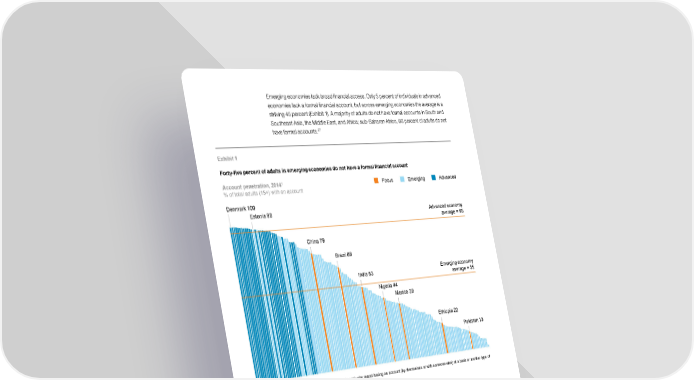 Emerging economies lack broad financial access. Only 5 percent of individuals in advanced economies lack a formal financial account, but across emerging economies the average is a striking 45 percent (Exhibit 1). A majority of adults do not have formal accounts in South and Southeast Asia, the Middle East, and Africa; sub-Saharan Africa, 66 percent of adults do not have formal accounts.27 Exhibit 1 Forty-five percent of adults in emerging economies do not have a formal financial account 1 Account penetration, 2014 Focus Emerging Advanced % of total adults (15+) with an account Denmark 100 Estonia 98 Advanced economy average = 95 China 79 Brazil 68 India 53 Emerging economy average = 55 Nigeria 44 Mexico 39 Ethiopia 22 Pakistan 13 1 Denotes the percentage of respondents (15+ years in age) who report having an account (by themselves or with someone else) at a bank or another type of financial institution, or through a mobile-money service. SOURCE: Global Findex database 2014, World Bank; McKinsey Global Institute analysis In emerging economies as a whole, 60 percent of the richest three quintiles have formal accounts, while only 46 percent of the poorest two quintiles do. There is a similar urban versus rural divide: 61 percent of urban adults have formal accounts compared with only 48 percent of rural adults. While 59 percent of men have access to bank accounts, only 50 percent of women do.28 The unbanked are not the only customers underserved by the financial sector. Many more people do not use their bank accounts actively and lack access to appropriate savings, credit, and insurance products. As a result, people in emerging economies rely heavily on cash—only 3 percent of transactions made by individuals are made through digital 29 means. Just 10 percent of individuals in emerging economies borrow money from 27 Sources are the Global Findex database 2014, World Bank, April 2015; World Development Indicators database, World Bank, 2016; and the McKinsey Digital Payments Map. 28 Ibid. 29 Based on weighted average of all digital payment categories for consumer-to-consumer, consumer-to- business, and consumer-to-government transactions. McKinsey Global Payments Map 2016 (2014 data). Digital finance Report 18 McKinsey Global Institute 1. The limited scope of finance in emerging economies today 0920 mc