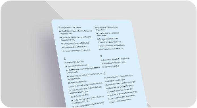 Mr. Azimullah Khan, 1LINK, Pakistan Mr. Ephrem Mekuria, Commercial Bank of Mr. Manish Khera, Financial Inclusion Professional and Ethiopia, Ethiopia Entrepreneur, India Mr. Yishak Mengesha, Commercial Bank of Mr. Melaku Kifle, Ministry of Finance and Economic Ethiopia, Ethiopia Cooperation, Ethiopia Mr. Francisco Mere, Bankaool, Mexico Mr. Christoph Kneiding, AccessCrédito, Brazil Mr. Abrar Mir, Habib Bank Limited, Pakistan Mr. Kabir Kumar, Omidyar Network, India Dr. Deepak Mohanty, Reserve Bank of India, India Dr. Peeyush Kumar, Ministry of Finance, India Mr. S S Mundra, Reserve Bank of India, India L N Mr. Rajiv Lall, IDFC Bank, India Mr. Getahun Nana, National Bank of Ethiopia, Ethiopia Mr. Jorge Lara, MasterCard, Mexico Mr. Ghalib Nishtar, Khushhali Bank, Pakistan Ms. Chidinma Lawanson, Enhancing Financial Innovation Mr. Tiago Novais, GSMA, Brazil & Access, Nigeria Mr. Teshome Legesse, Oromiya Credit and Savings Share O Company, Ethiopia Mr. Peter Li, CreditEase, China Ms. Omotade Odunowo, FETS Mobile Money, Nigeria Dr. Li Quan, Chinese Academy of Fiscal Sciences, China Mr. Mike Ogbalu, Interswitch, Nigeria Dr. Li Yan, Renmin University, Center for Microfinance Mr. Edoyemi Ogoh, Telecommunications Industry, Nigeria Initiatives & Networks, China Mr. Olatunde Ogunsola, FETS Mobile Money, Nigeria Ms. Lian Huishan, IFC, China Mr. Celestine Okobi, FirstBank, FirstMonie, Nigeria Mr. Tim Liu, Renmin University, Center for Microfinance Dr. Arkebe Oqubay, Office of the Prime Minister, Ethiopia Initiatives & Networks, China Mr. Juan Luis Ordaz Díaz, BBVA Bancomer, Mexico Mr. Javier Lizárraga, Ministry of Communications and Mr. Jorge A. Ortíz, Fintech Mexico, Mexico Transportation, Mexico Mr. Carlos Lopez-Moctezuma, BBVA Bancomer, Mexico P Mr. Rogerio Antonio Lucca, Central Bank of Brazil, Brazil Mr. Fernando Luege, Bankaool, Mexico Dr. U S Paliwal, Reserve Bank of India, India Ms. Pan Yiting, Yirendai, China M Dr. Alok Pande, Ministry of Finance, India Mr. Danniel Lafetá Machado, Central Bank of Brazil, Brazil Mr. João Pedro Paro Neto, MasterCard, Brazil Mr. Omar Moeen Malik, Easypaisa, Telenor, Pakistan Dr. N R Prabhala, Center for Advanced Financial Research and Learning, India, and University of Maryland, Mr. Wajahat Malik, The First MicroFinanceBank College Park, United States Ltd., Pakistan Mr. Luis Gustavo Mansur Siqueira, Central Bank of Q Brazil, Brazil Mr. Carlos Marmolejo, National Commission of the Dr. Simon Quinn, University of Oxford Retirement Savings System (CONSAR), Mexico Mr. Bilal Ali Qureshi, Karandaaz, Pakistan Ms. Lorenza Martinez, Bank of Mexico, Mexico Mr. Caio Megale, Itaú-Unibanco, Brazil 90 McKinsey Global Institute Acknowledgments