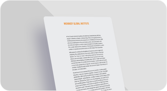 In the 25 years since its founding, the McKinsey Global Institute (MGI) has sought to develop a deeper understanding of the evolving global economy. As the business and economics research arm of McKinsey & Company, MGI aims to provide leaders in the commercial, public, and social sectors with the facts and insights on which to base management and policy decisions. The Lauder Institute at the University of Pennsylvania ranked MGI the world’s number-one private-sector think tank in its 2015 Global Think Tank Index. MGI research combines the disciplines of economics and management, employing the analytical tools of economics with the insights of business leaders. Our “micro-to-macro” methodology examines microeconomic industry trends to better understand the broad macroeconomic forces affecting business strategy and public policy. MGI’s in-depth reports have covered more than 20 countries and 30 industries. Current research focuses on six themes: productivity and growth, natural resources, labor markets, the evolution of global financial markets, the economic impact of technology and innovation, and urbanization. Recent reports have assessed the economic benefits of tackling gender inequality, a new era of global competition, Chinese innovation, and digital globalization. MGI is led by four McKinsey & Company senior partners: Jacques Bughin, James Manyika, Jonathan Woetzel, and Eric Labaye, MGI’s chairman. Michael Chui, Susan Lund, Anu Madgavkar, and Jaana Remes serve as MGI partners. Project teams are led by the MGI partners and a group of senior fellows, and include consultants from McKinsey offices around the world. These teams draw on McKinsey’s global network of partners and industry and management experts. Input is provided by the MGI Council, which co-leads projects and provides guidance; members are Andres Cadena, Richard Dobbs, Katy George, Rajat Gupta, Eric Hazan, Acha Leke, Scott Nyquist, Gary Pinkus, Shirish Sankhe, Oliver Tonby, and Eckart Windhagen. In addition, leading economists, including Nobel laureates, act as research advisers. The partners of McKinsey fund MGI’s research; it is not commissioned by any business, government, or other institution. For further information about MGI and to download reports, please visit www.mckinsey.com/mgi. Copyright © McKinsey & Company 2016