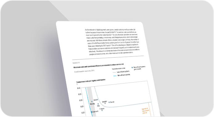 As the network of digital-payment users grows, overall costs incurred by providers fall further because of economies of scale (Exhibit 11). Transaction costs can decline by as 56 much as 50 percent when scale doubles. As costs decrease, providers can serve ever more customers profitably, in more ways, and charge lower prices, and so more people are included. With these network effects, adoption can be rapid. In Kenya, the number of users of the M-Pesa mobile-money system grew from zero to 40 percent of adults in just 57 One of the advantages of digital transactions is three years following its 2007 launch. that providers can serve customers who transact frequently and in small amounts cost- effectively. This allows for a full standard suite of financial services to become viable for people on lower incomes, who often make such small-scale transactions. Exhibit 11 Minimum scale and operational efficiency are essential to reduce service cost Credit transfer example, 2014 Illustrative scale curves More efficient systems Less efficient systems given volume More efficient systems Transaction costs per digital credit transfer $ 0.40 0.35 0.30 India 0.25 Norway Sweden France Italy 0.20 Denmark Finland 0.15 Operational improvement potential 0.10 Spain Netherlands United Kingdom China 0.05 Germany United States 0 0 0.2 0.4 0.6 0.8 1.0 3.0 3.2 3.4 3.6 3.8 4.0 4.2 4.4 9.2 9.4 11.6 11.8 Digital credit transfer, volume Minimum scale Billion needed SOURCE: McKinsey Global Payments Map 2016 (2014 data); McKinsey Global Institute analysis 56 Rodger Voorhies, Jason Lamb, and Megan Oxman, Fighting poverty, profitably: Transforming the economics of payments to build sustainable, inclusive financial systems, Bill and Melinda Gates Foundation, September 2013. 57 Ignacio Mas and Dan Radcliffe, “Mobile payments go viral: M-Pesa in Kenya,” Journal of Financial Transformation, volume 32, 2011. McKinsey Global Institute Digital finance for all: Powering inclusive growth in emerging economies 37