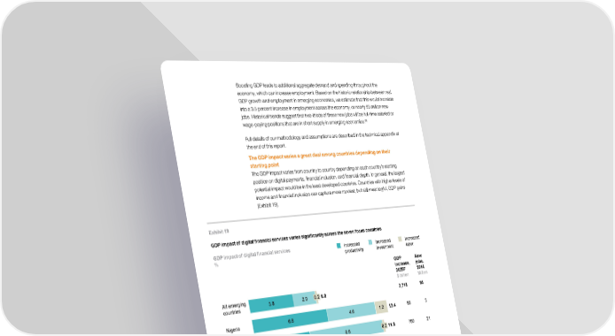 Boosting GDP leads to additional aggregate demand and spending throughout the economy, which can increase employment. Based on the historic relationship between real GDP growth and employment in emerging economies, we estimate that this would translate into a 3.5 percent increase in employment across the economy, or nearly 95 million new jobs. Historical trends suggest that two-thirds of these new jobs will be full-time salaried or 68 wage-paying positions that are in short supply in emerging economies. Full details of our methodology and assumptions are described in the technical appendix at the end of this report. The GDP impact varies a great deal among countries depending on their starting point The GDP impact varies from country to country depending on each country’s starting position on digital payments, financial inclusion, and financial depth. In general, the largest potential impact would be in the least developed countries. Countries with higher levels of income and financial inclusion can capture more modest, but still meaningful, GDP gains (Exhibit 19). Exhibit 19 GDP impact of digital financial services varies significantly across the seven focus countries GDP impact of digital financial services Increased Increased Increased % productivity investment labor GDP New increase, jobs, 2025F 2014 $ billion Million All emerging 3.8 2.0 0.2 6.0 3,718 95 countries Nigeria 6.6 4.6 1.2 12.4 88 3 India 4.8 6.8 0.2 11.8 700 21 Ethiopia 5.4 4.4 0 9.9 15 3 Pakistan 2.4 4.4 0.2 7.0 36 4 Brazil 3.6 1.7 0.2 5.5 152 4 Mexico 2.9 1.7 0.5 5.0 90 2 China 3.6 0.6 0 4.2 1,057 6 NOTE: Numbers may not sum due to rounding. SOURCE: McKinsey Global Institute analysis 68 We use data from the International Labour Organisation (ILO) on total employment in developing countries. DUPLICATE from ES This is defined as people working for a public or private employer who receive remuneration in the form of salary, wages, tips, or commission, or in-kind. In 2014, they report total employment in developing countries at 2.7 billion people. Salaried or wage-paying positions are a subset of total employment as defined by the ILO. 52 McKinsey Global Institute 3. Quantifying the benefits of digital finance
