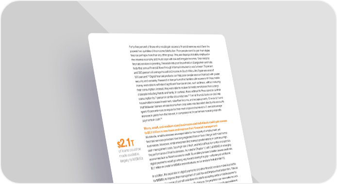 Forty-five percent of those who would gain access to financial services would be in the poorest two quintiles of the income distribution. Poor people stand to gain from digital finance perhaps more than any other group. They are disproportionately employed in the informal economy and must cope with low and irregular incomes. Their need for financial services is pressing. Research into poor households in Bangladesh and India finds that annual financial flows through informal instruments was between 75 percent and 330 percent of average household income; in South Africa, this figure was around 62 500 percent. Digital financial products can help poor people save and transact with greater security and certainty. Research in Kenya found that families with access to M-Pesa mobile money were able to withstand significant financial shocks, such as illness, without reducing their consumption; instead, they were able to receive domestic remittances from a range of people including friends and family. In contrast, those without M-Pesa services cut their 63 consumption by 7 percent in similar circumstances. Formal financial tools can also help households increase investment, raise their income, and escape poverty. One study found that Malawian farmers whose income from crop sales was deposited directly into accounts spent 13 percent more on inputs for their next crops and achieved a 21 percent average increase in yields from the harvest, in comparison to those farmers receiving crop sale 64 payments in cash. Micro, small, and medium-sized businesses and individuals could gain access to $2.1 trillion in new loans and improve their financial management Worldwide, small businesses are responsible for the majority of employment, yet $2.1T financial-services providers have long neglected them in favor of larger and more formal of loans could be businesses. Moreover, small enterprises that transact predominantly in cash incur high made available, cash management costs, face high risk of theft, and find it difficult to monitor and optimize largely to MSMEs the performance of their businesses. As noted in Chapter 1, half of all MSMEs in emerging economies lack sufficient access to credit. By enabling lenders to better assess credit risk, digital payments would go a long way toward closing this gap—unlocking an additional $2.1 trillion in credit for MSMEs and individuals, as our analysis finds (Exhibit 15). In addition, the expansion in digital payments and other financial services makes it possible for MSMEs to improve their management of cash flow and improve their bottom line. Take as illustration the owner of a small rural store who starts accepting cards or mobile payments through a digital POS on a smartphone. By doing so, the proprietor can view sales records and quickly place an order for replacement inventory to ensure that goods are available to meet demand. This allows more tailored management of suppliers and makes it easier to market to different customers. Finally, as is the case with individuals, digital accounts can help MSMEs reduce the cost— and risk—of dealing with cash. Many small businesses today incur significant costs from the security measures needed to protect their cash from theft by employees or others. They can be constrained from growing beyond a small number of locations due to the challenges of securing cash at a location without the owner present. Digital payments, by reducing the risk of theft, will help address this common constraint to small business expansion. 62 Daryl Collins et al., Portfolios of the poor: How the world’s poor live on $2 a day, Princeton University Press, 2009. 63 William Jack and Tavneet Suri, “Risk sharing and transactions costs: Evidence from Kenya’s mobile money revolution,” American Economic Review, volume 104, number 1, January 2014. 64 Lasse Brune et al., Facilitating savings for agriculture: Field experimental evidence from Malawi, NBER working paper number 20946, February 2015. 46 McKinsey Global Institute 3. Quantifying the benefits of digital finance