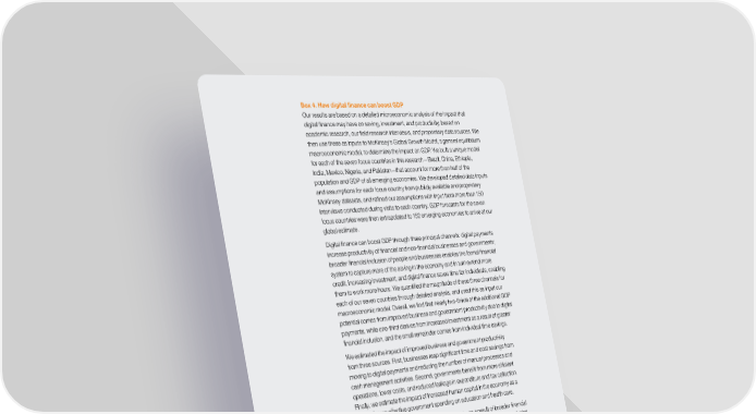 Box 4. How digital finance can boost GDP Our results are based on a detailed microeconomic analysis of the impact that digital finance may have on saving, investment, and productivity, based on academic research, our field research interviews, and proprietary data sources. We then use these as inputs to McKinsey’s Global Growth Model, a general equilibrium macroeconomic model, to determine the impact on GDP. We built a unique model for each of the seven focus countries in this research—Brazil, China, Ethiopia, India, Mexico, Nigeria, and Pakistan—that account for more than half of the population and GDP of all emerging economies. We developed detailed data inputs and assumptions for each focus country from publicly available and proprietary McKinsey datasets, and refined our assumptions with input from more than 150 interviews conducted during visits to each country. GDP forecasts for the seven focus countries were then extrapolated to 152 emerging economies to arrive at our global estimate. Digital finance can boost GDP through three principal channels: digital payments increase productivity of financial and non-financial businesses and governments; broader financial inclusion of people and businesses enables the formal financial system to capture more of the saving in the economy and in turn extend more credit, increasing investment; and digital finance saves time for individuals, enabling them to work more hours. We quantified the magnitude of these three channels for each of our seven countries through detailed analysis, and used this as input our macroeconomic model. Overall, we find that nearly two-thirds of the additional GDP potential comes from improved business and government productivity due to digital payments, while one-third derives from increased investment as a result of greater financial inclusion, and the small remainder comes from individual time savings. We estimated the impact of improved business and government productivity from three sources. First, businesses reap significant time and cost savings from moving to digital payments and reducing the number of manual processes and cash management activities. Second, governments benefit from more efficient operations, lower costs, and reduced leakage in expenditure and tax collection. Finally, we estimate the impact of increased human capital in the economy as a result of more effective government spending on education and health care. To gauge the increased investment in the economy as a result of broader financial inclusion of people and MSMEs, we first estimated how greater financial inclusion could increase deposits in the formal financial system of each country as individuals shift saving from informal sources into digital accounts. In India, for instance, we estimate there is potential to add nearly $800 billion in deposits due to the country’s high level of informal savings today. We then estimated the amount of new investment in each country’s capital stock from new credit, taking into account the growth in the deposit base and the starting level of credit and size of the credit gap in the country. We assume that by giving businesses and individuals bank accounts and generating a digital data trail, lenders will be better able to identify good credit risks. Finally, we estimated how digital finance can free up individuals’ time and enable more time for work or leisure, which have direct and indirect impacts on GDP, respectively. According to one study on monthly welfare transfers made to rural households in Niger, payments made via digital means saved an average of one- 1 hour travel time and over three hours waiting time per transfer. We estimate that individuals in emerging economies could save 12 billion hours a year by switching to digital financial services. 1 Jenny C. Aker et al., Payment mechanisms and anti-poverty programs: Evidence from a mobile money cash transfer experiment in Niger, CDG working paper number 268, July 2015. McKinsey Global Institute Digital finance for all: Powering inclusive growth in emerging economies 51