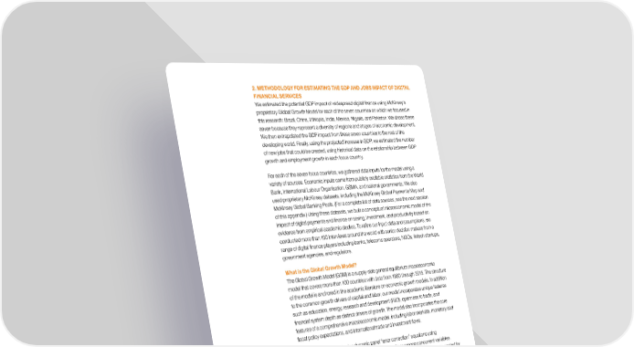 2. METHODOLOGY FOR ESTIMATING THE GDP AND JOBS IMPACT OF DIGITAL FINANCIAL SERVICES We estimated the potential GDP impact of widespread digital finance using McKinsey’s proprietary Global Growth Model for each of the seven countries on which we focused in this research: Brazil, China, Ethiopia, India, Mexico, Nigeria, and Pakistan. We chose these seven because they represent a diversity of regions and stages of economic development. We then extrapolated the GDP impact from these seven countries to the rest of the developing world. Finally, using the projected increase in GDP, we estimated the number of new jobs that could be created, using historical data on the relationship between GDP growth and employment growth in each focus country. For each of the seven focus countries, we gathered data inputs for the model using a variety of sources. Economic inputs came from publicly available statistics from the World Bank, International Labour Organisation, GSMA, and national governments. We also used proprietary McKinsey datasets, including the McKinsey Global Payments Map and McKinsey Global Banking Pools. (For a complete list of data sources, see the next section of this appendix.) Using these datasets, we built a conceptual microeconomic model of the impact of digital payments and finance on saving, investment, and productivity based on evidence from empirical academic studies. To refine our input data and assumptions, we conducted more than 150 interviews around the world with senior decision makers from a range of digital finance players including banks, telecoms operators, NGOs, fintech startups, government agencies, and regulators. What is the Global Growth Model? The Global Growth Model (GGM) is a supply-side general equilibrium macroeconomic model that covers more than 100 countries with data from 1960 through 2015. The structure of the model is anchored in the academic literature on economic growth models. In addition to the common growth drivers of capital and labor, our model incorporates unique features such as education, energy, research and development (R&D), openness to trade, and financial system depth as distinct drivers of growth. The model also incorporates the core features of a comprehensive macroeconomic model, including labor markets, monetary and fiscal policy expectations, and international trade and investment flows. The model is estimated using dynamic panel “error correction” equations using simultaneous equation techniques to capture interactions among concurrent variables. Validity of the equations is further tested using instrumental variable techniques to control for biased correlations between simultaneously interacting independent variables. The data underpinning the model are obtained from national governments, authoritative international sources, and datasets such as the Barro-Lee education database that are devised by researchers. These datasets are carefully merged to develop extended time series; where gaps remain, we impute missing data using standard econometric techniques. The production function used in the GGM is an augmented Cobb-Douglas production function with fixed capital, energy consumption, and human capital as distinct factors of production (Exhibit A2). The production function incorporates a nested constant elasticity of substitution function to capture the imperfect substitution between capital and energy. The coefficients on the Cobb-Douglas are estimated using the dynamic error correction approach noted above. The human capital index captures both labor supply and the quality of labor in a country. It is defined as the product of employment, average years of education, and an index of work McKinsey Global Institute Digital finance for all: Powering inclusive growth in emerging economies 95