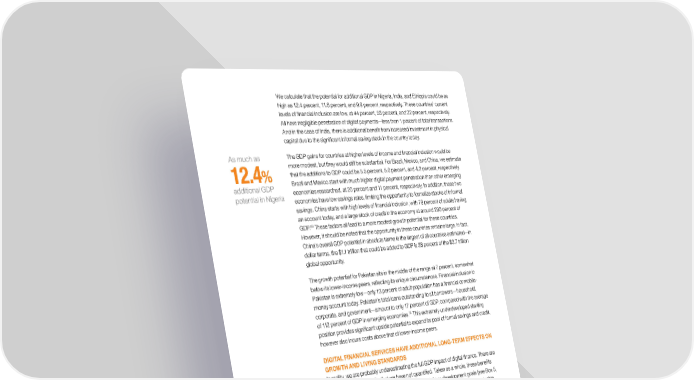 We calculate that the potential for additional GDP in Nigeria, India, and Ethiopia could be as high as 12.4 percent, 11.8 percent, and 9.9 percent, respectively. These countries’ current levels of financial inclusion are low, at 44 percent, 53 percent, and 22 percent, respectively. All have negligible penetration of digital payments—less than 1 percent of total transactions. And in the case of India, there is additional benefit from increased investment in physical capital due to the significant informal saving stock in the country today. As much as The GDP gains for countries at higher levels of income and financial inclusion would be more modest, but they would still be substantial. For Brazil, Mexico, and China, we estimate 12.4% that the additions to GDP could be 5.5 percent, 5.0 percent, and 4.2 percent, respectively. additional GDP Brazil and Mexico start with much higher digital payment penetration than other emerging potential in Nigeria economies researched, at 20 percent and 11 percent, respectively. In addition, these two economies have low savings rates, limiting the opportunity to formalize stocks of informal savings. China starts with high levels of financial inclusion, with 79 percent of adults having an account today, and a large stock of credit in the economy at around 290 percent of 69 GDP. These factors all lead to a more modest growth potential for these countries. However, it should be noted that the opportunity in these countries remains large. In fact, China’s overall GDP potential in absolute terms is the largest of all countries estimated—in dollar terms, the $1.1 trillion that could be added to GDP is 28 percent of the $3.7 trillion global opportunity. The growth potential for Pakistan sits in the middle of the range at 7 percent, somewhat below its lower-income peers, reflecting its unique circumstances. Financial inclusion in Pakistan is extremely low—only 13 percent of adult population has a financial or mobile- money account today. Pakistan’s total loans outstanding to all borrowers—household, corporate, and government—amount to only 17 percent of GDP, compared with the average 70 This extremely underdeveloped starting of 112 percent of GDP in emerging economies. position provides significant upside potential to expand its pool of formal savings and credit, however also incurs costs above that of lower-income peers. DIGITAL FINANCIAL SERVICES HAVE ADDITIONAL LONG-TERM EFFECTS ON GROWTH AND LIVING STANDARDS In reality, we are probably underestimating the full GDP impact of digital finance. There are $1.1T broader potential benefits that we have not quantified. Taken as a whole, these benefits GDP growth will contribute to progress toward meeting United Nations development goals (see Box 5, opportunity in “Digital financial services contribute to progress towards meeting the UN’s Sustainable China Development Goals.”) ƒ Raising the quality and quantity of health care and education, leading to improved human capital. It is well recognized in economic literature that human capital is as important as physical capital in spurring growth, particularly as the knowledge economy grows. Human capital benefits from investment in education and health care. Digital payments and mobile accounts contribute to improved quality and quantity of these services in several ways. As women gain access to financial services and can better control a portion of household income, they tend to prioritize investment in 71 Micropayments can make school fees more affordable for poor education and health. households. Moreover, governments that pay teachers and health-care workers digitally reduce absenteeism, resulting in more and better services. In India, the attendance rate of teachers is 90 percent in states that have reliable digital salary payment systems, but 69 McKinsey Global Institute Country Debt database. 70 McKinsey Global Institute Financial Assets database. 71 Matthias Doepke and Michèle Tertilt, Does female empowerment promote economic development? Centre for Economic Policy Research discussion paper number 8441, June 2011. McKinsey Global Institute Digital finance for all: Powering inclusive growth in emerging economies 53