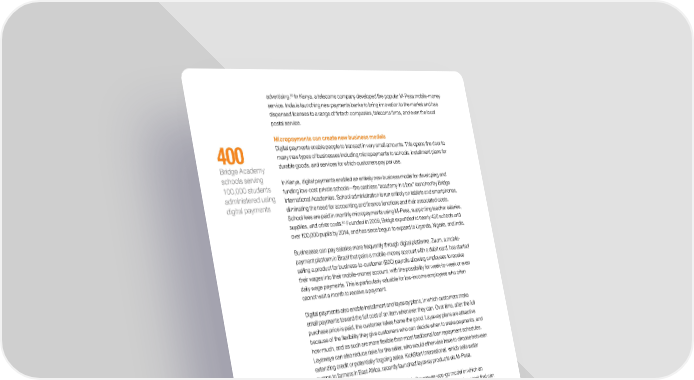 59 advertising. In Kenya, a telecoms company developed the popular M-Pesa mobile-money service. India is launching new payments banks to bring innovation to the market and has dispensed licenses to a range of fintech companies, telecoms firms, and even the local postal service. Micropayments can create new business models Digital payments enable people to transact in very small amounts. This opens the door to 400 many new types of businesses including micropayments to schools, installment plans for Bridge Academy durable goods, and services for which customers pay per use. schools serving In Kenya, digital payments enabled an entirely new business model for developing and 100,000 students funding low-cost private schools—the cashless “academy in a box” launched by Bridge administered using International Academies. School administration is run entirely on tablets and smartphones, digital payments eliminating the need for accounting and finance functions and their associated costs. School fees are paid in monthly micropayments using M-Pesa, supporting teacher salaries, 60 supplies, and other costs. Founded in 2009, Bridge expanded to nearly 400 schools and over 100,000 pupils by 2014, and has since begun to expand to Uganda, Nigeria, and India. Businesses can pay salaries more frequently through digital platforms. Zuum, a mobile- payment platform in Brazil that pairs a mobile-money account with a debit card, has started selling a product for business-to-customer (B2C) payrolls allowing employees to receive their wages into their mobile-money account, with the possibility for week-to-week or even daily wage payments. This is particularly valuable for low-income employees who often cannot wait a month to receive a payment. Digital payments also enable installment and layaway plans, in which customers make small payments toward the full cost of an item whenever they can. Over time, after the full purchase price is paid, the customer takes home the good. Layaway plans are attractive because of the flexibility they give customers who can decide when to make payments, and how much, and as such are more flexible than most traditional loan repayment schedules. Layaways can also reduce risks for the seller, who would otherwise have to choose between extending credit or potentially forgoing sales. KickStart International, which sells water pumps to farmers in East Africa, recently launched layaway products via M-Pesa. The most extreme example of micropayments is the pay-as-you-go model in which an individual pays per use. Pay-as-you-go offerings involve leasing an expensive asset that can be turned off remotely by the provider when payment is not received. Families can enjoy the benefits from an asset that they would not be able to purchase, while the provider can easily collect payments, making the venture both profitable and low-risk (see Box 3, “Pay-as-you- go and M-Kopa Solar”). 59 See, for instance, Disruptive technologies: Advances that will transform life, business, and the global economy, McKinsey Global Institute, May 2013. 60 Bridge International Academies website, www.bridgeinternationalacademies.com/ 40 McKinsey Global Institute 2. The power of digital to transform finance