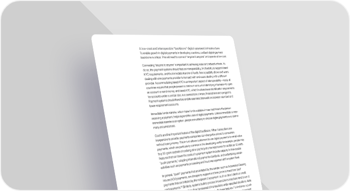 A low-cost and interoperable “backbone” digital-payment infrastructure To enable growth in digital payments in developing countries, a robust digital-payment backbone is critical. This will need to connect “anyone to anyone” and operate at low cost. Connecting “anyone to anyone” is important to achieving scale and network effects. To do so, the payment systems should feature interoperability, the flexibility to support tiered KYC requirements, and the immediate transfer of funds. Interoperability allows end-users dealing with one payments provider to transact with end-users dealing with a different provider. Accommodating tiered KYC is an important aspect of interoperability—nearly all countries require that people present a minimum amount of identifying information to open an account or send money, and tiered KYC, which involves lower identification requirements for accounts under a certain size, is a cornerstone of many financial inclusion programs. Payment systems should therefore enable seamless transactions between standard and lower-requirement accounts. Immediate funds transfer, which make funds available in near real time to the person receiving a payment, helps expand the uses of digital payments. Unless immediate or near- immediate transfer is an option, people are unlikely to choose digital payments over cash in many circumstances. Cost is another important feature of the digital backbone. When transactions are inexpensive to provide, payments companies can charge low prices to consumers without losing money. This in turn allows customers to use digital payments for small-value payments, which are particularly common in the developing world; for example, people may buy 50-gram sachets of cooking oil or pay for just a few kale leaves for as little as 10 cents. Features that can lower the costs of a payment system include capacity for irrevocable “push payments,” adopting international payments standards, and undertaking certain activities such as payments processing and fraud management at the system level. In general, “push” payments that are initiated by the sender, such as Automated Clearing House (ACH) payments, are cheaper to support and less prone to fraud than “pull” payments that are initiated by the recipient of a payment, such as direct debits or credit 85 card payments. Similarly, systems built to process irrevocable transactions tend to run at lower cost than those that allow for reversal of transactions under specified situations. Note that consumer protections still can be maintained with these features. For instance, a push payment can incorporate a message from a merchant requesting payment, and payment providers could offer value-added services that allow for reversals. Use of internationally accepted payments standards such as ISO 20022 rather than system- specific proprietary standards also helps lower providers’ costs. This allows banks and other providers to use the same back-end system for both domestic and international 86 transactions, enhancing efficiency. A final approach to controlling costs is to perform services that benefit from economies of scale, such as payment processing and fraud detection, at the payment-system level rather than by individual providers. Payment processing requires large fixed costs for buying and maintaining hardware and for developing and maintaining software—performing this at the payment-system level spreads costs over all providers. Moreover, fraud is easier to detect with more data, so shared databases at the system level can significantly improve detection and reduce fraud costs. 85 ACH payments are electronic payments created when the customer gives an originating institution, corporation, or other customer authorization to debit directly from a checking or saving. 86 ISO 20022 is a universal financial industry message scheme. It creates a standardized framework for different systems to communicate with each other to facilitate transactions and other business processes. McKinsey Global Institute Digital finance for all: Powering inclusive growth in emerging economies 63