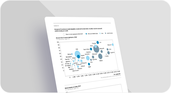 Exhibit 9 Access to financial accounts depends on national income levels—but this is not the case with mobile-money accounts Size of circle represents 2014 GDP Africa and Middle East Asia Latin America 1 Account at a financial institution, 2014 % of population, aged 15+ 100 90 Thailand Iran 80 Brazil Malaysia 70 India South Africa Venezuela 60 Namibia Chile 50 Kenya Indonesia Bangladesh Nigeria Botswana Argentina 40 Rwanda Ghana Bolivia Uruguay 30 Uganda Colombia 20 Ethiopia Zambia Philippines Peru Mexico Zimbabwe Honduras 10 Mali Vietnam 0 Tanzania Pakistan Egypt Côte d’Ivoire 0 2,000 4,000 6,000 8,000 10,000 12,000 14,000 16,000 18,000 20,000 22,000 24,000 26,000 Per capita GDP Purchasing power parity, current international $ 2 Mobile-money account, 2014 % of population, aged 15+ 100 90 80 70 60 Kenya 50 Côte d’Ivoire 40 Tanzania Uganda Brazil 30 Ghana India Indonesia Botswana 20 Zimbabwe Pakistan Namibia South Africa Rwanda Zambia Philippines Mexico Chile 10 Mali Peru Uruguay 0 Ethiopia Bangladesh Bolivia Colombia Venezuela Malaysia Honduras Vietnam Nigeria Egypt Thailand Iran Argentina 0 2,000 4,000 6,000 8,000 10,000 12,000 14,000 16,000 18,000 20,000 22,000 24,000 26,000 Per capita GDP Purchasing power parity, current international $ 1 Percentage of respondents who report having an account (by themselves or with someone else) at a bank or another type of financial institution. 2 Percentage of respondents who report personally using a mobile phone to pay bills or to send or receive money, wages, government transfers, or payments for agricultural products through a GSMA Mobile Money for the Unbanked (MMU) service in the past 12 months. SOURCE: Global Findex database 2014, World Bank; World Bank; McKinsey Global Institute analysis McKinsey Global Institute Digital finance for all: Powering inclusive growth in emerging economies 35