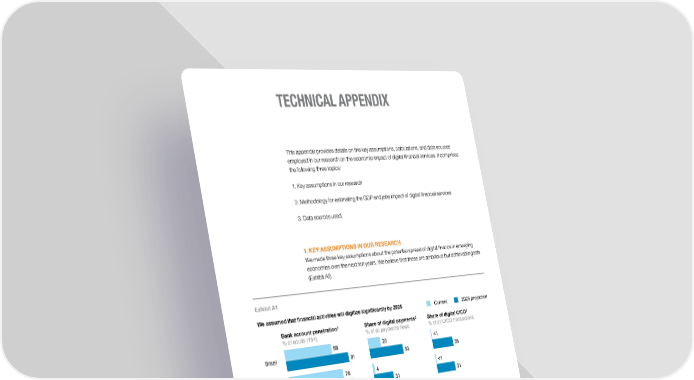 TECHNICAL APPENDIX This appendix provides details on the key assumptions, calculations, and data sources employed in our research on the economic impact of digital financial services. It comprises the following three topics: 1. Key assumptions in our research 2. Methodology for estimating the GDP and jobs impact of digital financial services 3. Data sources used. 1. KEY ASSUMPTIONS IN OUR RESEARCH We made three key assumptions about the potential spread of digital finance in emerging economies over the next ten years. We believe that these are ambitious but achievable goals (Exhibit A1). Exhibit A1 We assumed that financial activities will digitize significantly by 2025 Current 2025 projection 1 2 3 Bank account penetration Share of digital payments Share of digital CICO % of adults (15+) % of all payments flows % of all CICO transactions Brazil 68 20 <1 91 53 35 China 79 4 <1 91 31 31 Ethiopia 22 <1 <1 91 30 95 India 53 <1 <1 91 25 60 Mexico 39 11 <1 91 33 51 Nigeria 44 <1 <1 91 30 68 Pakistan 13 <1 <1 91 24 84 1 Percentage of respondents (15+ years in age) who report having an account (by themselves or with someone else) at a bank or another type of financial institution, or through a mobile-money service. 2 Percentage of all payments flows conducted via non-cash, non-check instruments. 3 Percentage of all cash-in cash-out (CICO) transactions that occur via mobile-money agent or POS terminal. SOURCE: World Bank; GSMA; McKinsey Global Payments Map; McKinsey Global Institute analysis Digital finance Appendix 0920 mc