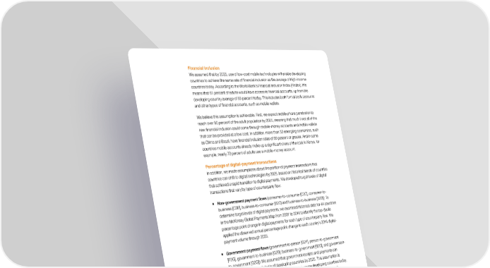 Financial inclusion We assumed that by 2025, use of low-cost mobile technologies will enable developing countries to achieve the same rate of financial inclusion as the average of high-income countries today. According to the World Bank’s Financial Inclusion Index (Findex), this means that 91 percent of adults would have access to financial accounts, up from the developing country average of 55 percent today. This includes both formal bank accounts and other types of financial accounts, such as mobile wallets. We believe this assumption is achievable. First, we expect mobile phone penetration to reach over 90 percent of the adult population by 2025, meaning that much if not all of the new financial inclusion could come through mobile-money accounts and mobile wallets that can be provided at a low cost. In addition, more than 30 emerging economies, such as China and Brazil, have financial inclusion rates of 65 percent or greater. And in some countries mobile accounts already make up a significant share of the total; in Kenya, for example, nearly 70 percent of adults use a mobile-money account. Percentage of digital-payment transactions In addition, we made assumptions about the portion of payment transactions that countries can shift to digital technologies by 2025, based on historical trends of countries that achieved a rapid transition to digital payments. We developed target levels of digital transactions that vary by type of counterparty flow: ƒ Non-government payment flows (consumer-to-consumer [C2C], consumer-to- business [C2B], business-to-consumer [B2C] and business-to-business [B2B]): To determine target levels of digital payments, we examined historical data for 44 countries in the McKinsey Global Payments Map from 2007 to 2014 to identify the top-decile percentage point change in digital payments for each type of counterparty flow. We applied the observed annual percentage point change to each country’s 2014 digital- payment volume through 2025. ƒ Government payment flows (government-to-person [G2P], person-to-government [P2G], government-to-business [G2B], business-to-government [B2G], and government- to-government [G2G]): We assumed that government receipts and payments can become 100 percent digital in all developing countries by 2025. This assumption is based on what we see for G2P and P2G payments in some developing countries today, including Brazil (98 percent digital), Mexico (90 percent), and China (85 percent). Percentage of CICO transactions conducted via POS terminal or mobile- money agent Our last key assumption was on the percentage of CICO transactions conducted via POS terminals or mobile-money agents, versus more costly ATMs and bank branches. We assumed that the percentage of CICO transactions that will be conducted through POS terminals or mobile-money agents, ATMs, and bank branches will be proportional to the projected volume of mobile-money agents, ATMs, and bank branches, respectively. We assumed that the number of mobile-money agents will grow to meet the needs of all additional people with financial accounts, based on the historical growth of agents observed in Kenya. We assumed that the number of ATMs and bank branches will remain at their 2014 levels. 94 McKinsey Global Institute Technical appendix