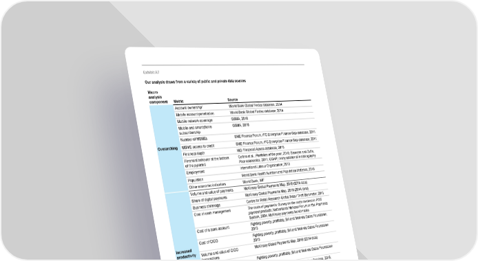 Exhibit A7 Our analysis draws from a variety of public and private data sources Macro analysis component Metric Source 1 Account ownership World Bank Global Findex database, 2014 Mobile account penetration World Bank Global Findex database, 2014 Mobile network coverage GSMA, 2016 Mobile and smartphone GSMA, 2016 subscribership Number of MSMEs SME Finance Forum, IFC Enterprise Finance Gap database, 2011 Overarching MSME access to credit SME Finance Forum, IFC Enterprise Finance Gap database, 2011 Financial depth MGI Financial Assets database, 2015 Financial behavior at the bottom Collins et al., Portfolios of the poor, 2010; Banerjee and Duflo, of the pyramid Poor economics, 2011; CGAP; many additional in bibliography Employment International Labour Organisation, 2015 Population World Bank Health Nutrition and Population Statistics, 2016 Other economic indicators World Bank, IMF Volume and value of payments McKinsey Global Payments Map, 2016 (2014 data) Share of digital payments McKinsey Global Payments Map, 2016 (2014 data) Business shrinkage Centre for Retail Research Global Retail Theft Barometer, 2011 Cost of cash management The costs of payments: Survey on the costs involved in POS payment products, Netherlands National Forum on the Payments System, 2004; McKinsey payments benchmarks Cost of a bank account Fighting poverty, profitably, Bill and Melinda Gates Foundation, 2013 Cost of CICO Fighting poverty, profitably, Bill and Melinda Gates Foundation Increased 2013 productivity Volume and value of CICO McKinsey Global Payments Map, 2016 (2014 data) transactions Cost of transactions Fighting poverty, profitably, Bill and Melinda Gates Foundation 2013 Loan origination costs Bank Administration Institute (BAI) Banking Services, 2015; McKinsey banking benchmarks Density of ATMs, branches, and POS World Bank Global Findex database, 2014 Density of agents World Bank Global Findex database, 2014 Government leakage Inclusive growth and financial security: The benefits of e-payments to Indian society, McKinsey & Company,2010 Retail and SME deposits McKinsey Panorama Global Banking Pools, 2016 SME revenue World Bank Enterprise Survey, 2016 Increased Bank system slack EIU Market Indicators, Loan and deposit data, 2016; IMF Financial investment in Soundness Indicators, 2015 physical Corporate return on capital McKinsey Corporate Performance Analysis Tool (CPAT) capital SME return on capital IMF International Financial Statistics, 2016; McKinsey Panorama Global Banking Pools, 2016; Dalberg, Report on support to SMEs in developing countries through financial intermediaries, 2011 Private-sector debt MGI Country Debt database, 2015 Increased See “Density of ATMs, branches, and POS” and “Density of agents” metrics labor 1 Includes breakdowns by wealth, gender, urban vs. rural, and so on. SOURCE: McKinsey Global Institute analysis 106 McKinsey Global Institute Technical appendix