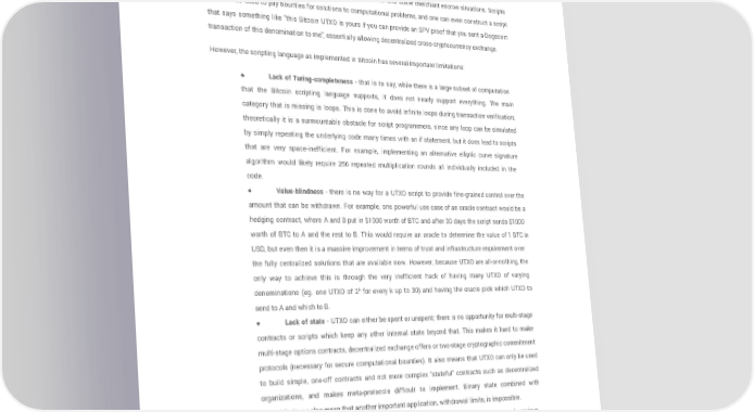 implemented via a script: the script takes an elliptic curve signature as input, verifies it against the transaction and the address that owns the UTXO, and returns 1 if the verification is successful and 0 otherwise. Other, more complicated, scripts exist for various additional use cases. For example, one can construct a script that requires signatures from two out of a given three private keys to validate ("multisig"), a setup useful for corporate accounts, secure savings accounts and some merchant escrow situations. Scripts can also be used to pay bounties for solutions to computational problems, and one can even construct a script that says something like "this Bitcoin UTXO is yours if you can provide an SPV proof that you sent a Dogecoin transaction of this denomination to me", essentially allowing decentralized cross-cryptocurrency exchange. However, the scripting language as implemented in Bitcoin has several important limitations: ● Lack of Turing-completeness - that is to say, while there is a large subset of computation that the Bitcoin scripting language supports, it does not nearly support everything. The main category that is missing is loops. This is done to avoid infinite loops during transaction verification; theoretically it is a surmountable obstacle for script programmers, since any loop can be simulated by simply repeating the underlying code many times with an if statement, but it does lead to scripts that are very space-inefficient. For example, implementing an alternative elliptic curve signature algorithm would likely require 256 repeated multiplication rounds all individually included in the code. ● Value-blindness - there is no way for a UTXO script to provide fine-grained control over the amount that can be withdrawn. For example, one powerful use case of an oracle contract would be a hedging contract, where A and B put in $1000 worth of BTC and after 30 days the script sends $1000 worth of BTC to A and the rest to B. This would require an oracle to determine the value of 1 BTC in USD, but even then it is a massive improvement in terms of trust and infrastructure requirement over the fully centralized solutions that are available now. However, because UTXO are all-or-nothing, the only way to achieve this is through the very inefficient hack of having many UTXO of varying k denominations (eg. one UTXO of 2 for every k up to 30) and having the oracle pick which UTXO to send to A and which to B. ● Lack of state - UTXO can either be spent or unspent; there is no opportunity for multi-stage contracts or scripts which keep any other internal state beyond that. This makes it hard to make multi-stage options contracts, decentralized exchange offers or two-stage cryptographic commitment protocols (necessary for secure computational bounties). It also means that UTXO can only be used to build simple, one-off contracts and not more complex "stateful" contracts such as decentralized organizations, and makes meta-protocols difficult to implement. Binary state combined with value-blindness also mean that another important application, withdrawal limits, is impossible. ● Blockchain-blindness - UTXO are blind to blockchain data such as the nonce and previous hash. This severely limits applications in gambling, and several other categories, by depriving the scripting language of a potentially valuable source of randomness. Page 12 ethereum.org