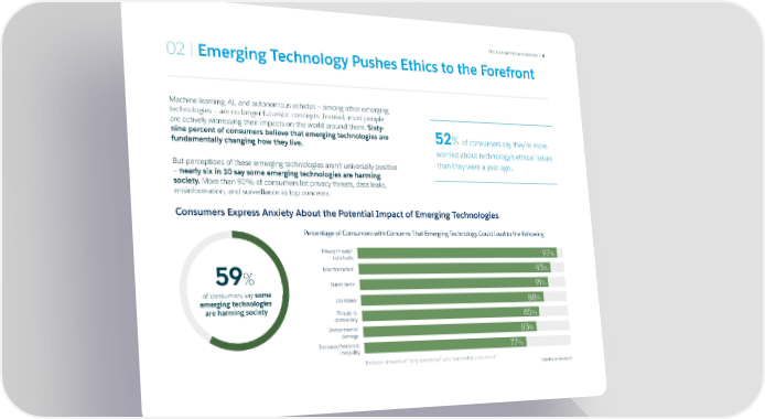 Ethical Leadership and Business | 8 02 | Emerging Technology Pushes Ethics to the Forefront Machine learning, AI, and autonomous vehicles — among other emerging technologies — are no longer futuristic concepts. Instead, most people are actively witnessing their impacts on the world around them. Sixty- nine percent of consumers believe that emerging technologies are 52% of consumers say they’re more fundamentally changing how they live. worried about technology’s ethical issues . But perceptions of these emerging technologies aren’t universally positive than they were a year ago — nearly six in 10 say some emerging technologies are harming society. More than 90% of consumers list privacy threats, data leaks, misinformation, and surveillance as top concerns. Consumers Express Anxiety About the Potential Impact of Emerging Technologies Percentage of Consumers with Concerns That Emerging Technology Could Lead to the Following Privacy threats/ 97% data leaks Misinformation 93% 59% Surveillance 91% of consumers say some emerging technologies Job losses 88% are harming society Threats to 85% democracy Environmental 83% damage Increased/widened 77% inequality Includes answers of “very concerned” and “somewhat concerned.” Salesforce Research