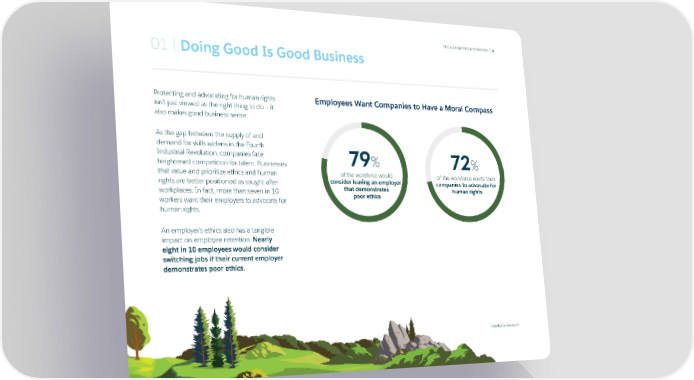 Ethical Leadership and Business | 5 01 | Doing Good Is Good Business Protecting and advocating for human rights Employees Want Companies to Have a Moral Compass isn’t just viewed as the right thing to do — it also makes good business sense. As the gap between the supply of and demand for skills widens in the Fourth Industrial Revolution, companies face 79% 72% heightened competition for talent. Businesses that value and prioritize ethics and human of the workforce would of the workforce wants their rights are better positioned as sought-after consider leaving an employer companies to advocate for workplaces. In fact, more than seven in 10 that demonstrates human rights workers want their employers to advocate for poor ethics human rights. An employer’s ethics also has a tangible impact on employee retention. Nearly eight in 10 employees would consider switching jobs if their current employer demonstrates poor ethics. Salesforce Research