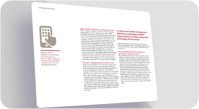 12 PwC Global FinTech Report Safe and fast payments are emerging trends 2.3 Asset and wealth management Mobile smartphone adoption is one of the drivers of changing shifts from technology-enabled payments patterns. Today’s mobile-first consumers expect immediacy, convenience and security to be integral to payments. human advice to human-supported In our culture of on-demand streaming of digital products and technology-driven advice services, archaic payment solutions that take days rather than seconds for settlement are considered unacceptable, motivating both incumbents and newcomers to develop solutions that Figure 8 clearly demonstrates that the main trend the asset enable transfer of funds globally in real-time. End users also and wealth management industry is focusing on at present is the expect a consistent omni-channel experience in banking and increased sophistication of data analytics to better identify and payments, making digital wallets key to streamlining the user quantify risk. experience and enabling reduced friction at the checkout. Finally, end users expect all of this to be safe. Security and More sophisticated data analytics as a Mobile smartphone privacy are paramount to galvanising support for nascent forms gateway for emerging trends adoption is one of the drivers of digital transactions, and solutions that leverage biometrics The proliferation of data, along with new methods to capture it for fast and robust authentication coupled with obfuscation and the declining cost of doing so, is reshaping the investment of changing payments technologies, such as tokenisation, are critical components in patterns. Today’s mobile-first creating an environment of trust for new payment paradigms. landscape. New uses of data analytics span the spectrum from consumers expect immediacy, institutional trading and risk management to small notional convenience and security to So what? – Speed up, but in a secure way retail wealth management. The increased sophistication of data be integral to payments. Speed, security and digitisation will be growing trends for the analytics is reducing the asymmetry of information between payments ecosystem. In an environment where traditional small- and large-scale financial institutions and investors, loyalty to financial institutions is being diminished and barriers with the latter taking advantage of automated FS solutions. to entry from third parties are lowered, the competitive Sophisticated analytics also uses advanced trading and risk landscape is fluid and potentially changeable, as newcomers like management approaches such as behavioural and predictive Apple Pay, Venmo and Dwolla have demonstrated. Incumbents algorithms, enabling the analysis of all transactions in real time. that are slow to adapt to change could well find themselves Wealth managers are increasingly using analytics solutions losing market share to companies that may not have a traditional at every stage of the customer relationship to increase client payments pedigree, but that have a critical mass of users and the retention and reduce operational costs. By incorporating network connectivity to enable payment experiences that are broader and multi-source data sets, they are forming a more considered at least equivalent to the status quo. While most of holistic view of customers to better anticipate and satisfy their these solutions “ride the rails” of traditional banking, in doing so needs. they risk losing control of the customer experience and ceding ground to innovators, or “steers”, who conduct transactions as they see fit.