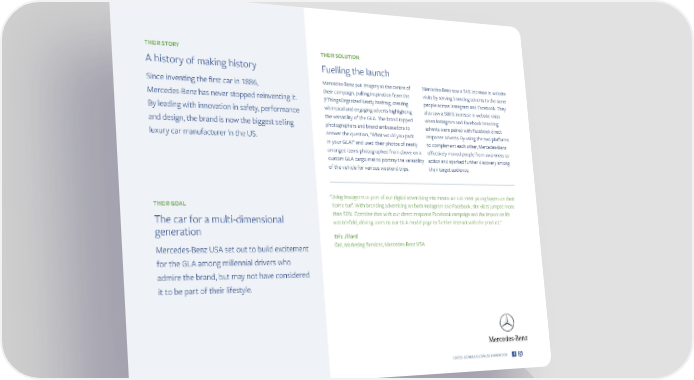 THEIR STORY THEIR SOLUTION A history of making history Fuelling the launch Since inventing the first car in 1886, Mercedes-Benz put imagery at the centre of Mercedes-Benz saw a 54% increase in website their campaign, pulling inspiration from the visits by serving branding adverts to the same Mercedes-Benz has never stopped reinventing it. #ThingsOrganizedNeatly hashtag, creating people across Instagram and Facebook. They By leading with innovation in safety, performance whimsical and engaging adverts highlighting also saw a 580% increase in website visits the versatility of the GLA. The brand tapped when Instagram and Facebook branding and design, the brand is now the biggest selling photographers and brand ambassadors to adverts were paired with Facebook direct luxury car manufacturer in the US. answer the question, "What would you pack response adverts. By using the two platforms in your GLA?" and used their photos of neatly to complement each other, Mercedes-Benz arranged items photographed from above on a effectively moved people from awareness to custom GLA cargo mat to portray the versatility action and sparked further discovery among of the vehicle for various weekend trips. their target audience. "Using Instagram as part of our digital advertising mix means we can meet young buyers on their THEIR GOAL home turf. With branding advertising on both Instagram and Facebook, site visits jumped more The car for a multi-dimensional than 50%. Combine that with our direct response Facebook campaign and the impact on lift generation was tenfold, driving users to our GLA model page to further interact with the product." Eric Jillard Mercedes-Benz USA set out to build excitement GM, Marketing Services, Mercedes-Benz USA for the GLA among millennial drivers who admire the brand, but may not have considered it to be part of their lifestyle. CROSS-BORDER BUSINESS HANDBOOK
