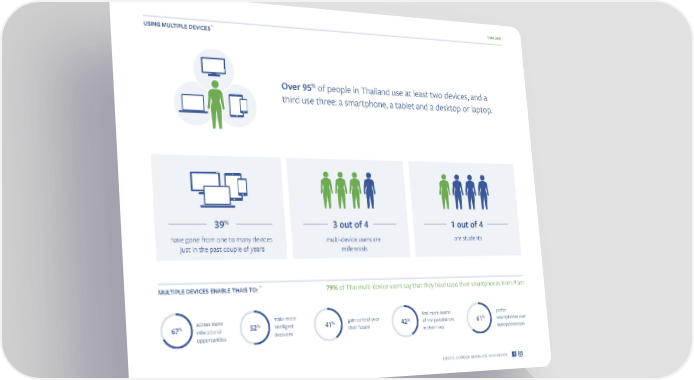 THAILAND 14 USING MULTIPLE DEVICES % Over 95 of people in Thailand use at least two devices, and a third use three: a smartphone, a tablet and a desktop or laptop. % 39 3 out of 4 1 out of 4 have gone from one to many devices multi-device users are are students just in the past couple of years millennials MULTIPLE DEVICES ENABLE THAIS TO: 14 79% of Thai multi-device users say that they have used their smartphones from 9 am access more make more gain control over feel more aware prefer % % intelligent % % of the possibilities % smartphones over 67 educational 52 41 their future 42 61 opportunities decisions in their lives laptops/desktops CROSS-BORDER BUSINESS HANDBOOK