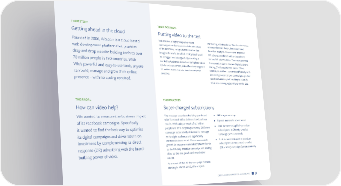 THEIR STORY THEIR SOLUTION Getting ahead in the cloud Putting video to the test Founded in 2006, Wix.com is a cloud-based Wix created a highly engaging video Partnering with Facebook, Wix then launched campaign that demonstrated the simplicity a comprehensive Reach, Resonance and web development platform that provides of its interface, using advert creative that Reaction study to compare the impact of drag-and-drop website building tools to over imagined a world in which reality itself could DR adverts combined with video adverts be 'dragged and dropped'. By creating a versus DR adverts alone. The measurement 70 million people in 190 countries. With Lookalike Audience based on its highest-value framework included Nielsen Digital Adverts Wix's powerful and easy-to-use tools, anyone US-based customers, Wix effectively targeted Rating (DAR) and Nielsen Brand Effect 15 million customers to test its campaign studies, as well as a conversion lift study with can build, manage and grow their online creative. two test groups and two control groups that presence – with no coding required. used conversion pixel tracking to identify what was driving registrations on the site. THEIR GOAL THEIR SUCCESS How can video help? Super-charged subscriptions Wix wanted to measure the business impact The message was clear: building your brand • 95% target accuracy of its Facebook campaigns. Specifically with Facebook video delivers hard business • 8-point increase in advert recall results. With unique reach of 6.7 million • 6.8% incremental uplift in premium it wanted to find the best way to optimise people and 95% targeting accuracy, Wix's test subscriptions in DR-only creative its digital campaigns and drive return on campaign successfully delivered its message campaign (versus control) to the right audience and significantly investment by complementing its direct increased advert recall. There was notable • 7.4% incremental uplift in premium response (DR) advertising with the brand- growth in new premium subscriptions thanks subscriptions in sequenced creative to the DR-only creative campaign, and adding (DR + video) campaign (versus control) building power of video. video to the mix produced even better results. As a result of the 40-day campaign that ran starting in March 2015, Wix enjoyed: CROSS-BORDER BUSINESS HANDBOOK