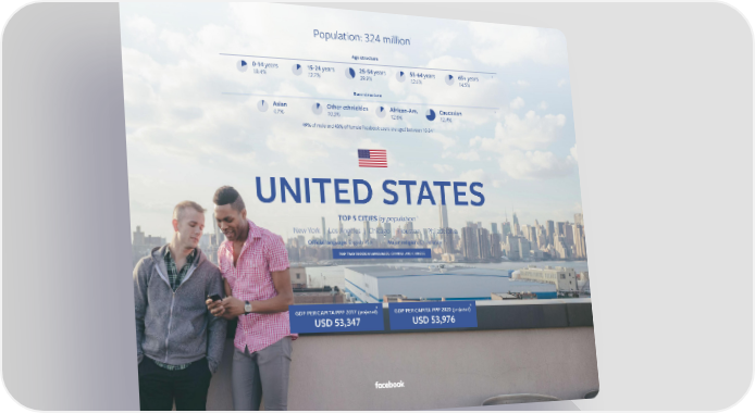 Population: 324 million1 Age structure 0-14 years 15-24 years 25-54 years 55-64 years 65+ years 2 19.4% 13.7% 39.9% 12.6% 14.5% Race structure Asian Other ethnicities African-Am. Caucasian 3 4.7% 10.3% 12.6% 72.4% 49% of male and 43% of female Facebook users are aged between 18-34 4 UNITED STATES TOP 5 CITIES by population 5 New York | Los Angeles | Chicago | Houston | Philadelphia Official language: English 95% Major religion: Christianity 6 7 TOP TWO FOREIGN LANGUAGES: SPANISH AND CHINESE 8 8 GDP PER CAPITA PPP 2017 (projected) GDP PER CAPITA PPP 2020 (projected) USD 53,347 USD 53,976