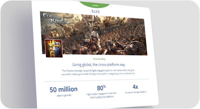 GAMING Success story Going global, the cross-platform way The Chinese developer acquired highly engaged players in new markets after taking its successful mobile game Clash of Kings cross-platform, integrating it into Facebook.com. % 50 million 80 4x players globally higher player engagement rate than increase in average playtime before going cross-platform