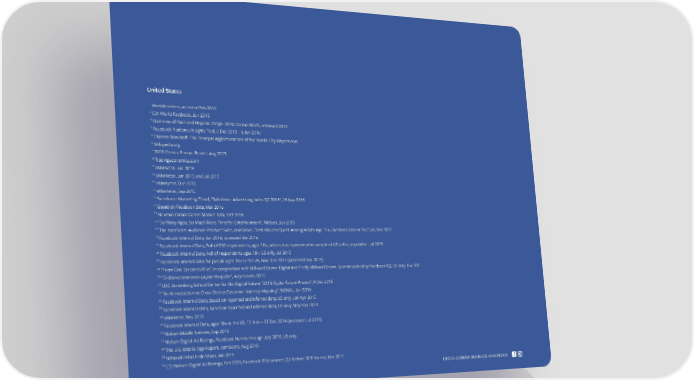 United States 1 Worldometers, accessed Feb 2016 2 CIA World Factbook, Jun 2015 3 Overview of Race and Hispanic Origin: 2010, Census Briefs, retrieved 2013 4 Facebook Audience Insights Tool, 6 Dec 2015 – 6 Jan 2016 5 Thomas Brinkhoff: The Principal Agglomerations of the World, City Mayors.com 6 Wikipedia.org 7 2011 Census Bureau Report, Aug 2013 8 Tradingeconomics.com 9 eMarketer, Jun 2015 10 eMarketer, Jun 2015 and Jul 2015 11 eMarketer, Dec 2015 12 eMarketer, Sep 2015 13 Salesforce Marketing Cloud, "Salesforce Advertising Index Q2 2015", 25 Nov 2015 14 Based on Facebook data, Mar 2016 15 Newzoo Global Games Market Data, Oct 2015 16 "So Many Apps, So Much More Time for Entertainment", Nielsen, Jun 2015 17 The comScore Audience Product Suite, comScore, Total Minutes Spent Among Adults Age 15+, Facebook.com vs YouTube, Dec 2015 18 Facebook Internal Data, Jan 2016, accessed Jan 2016 19 Facebook Internal Data, Poll of 500 respondents, ages 18+, selected as representative sample of US online population, Jul 2015 20 Facebook Internal Data, Poll of respondents ages 18+, US only, Jul 2015 21 Facebook internal data for people ages 18+ in the US, Nov-Dec 2014 (accessed Sep 2015) 22 "From One Screen to Five", in conjunction with Millward Brown Digital and Firefly Millward Brown, (commissioned by Facebook IQ). US only, N = 500 23 "Global-ecommerce-payments-guide", Adyen.com, 2015 24 USC Annenberg School Center for the Digital Future, "2015 Digital Future Project", 9 Dec 2015 25 "An Introduction to Cross-Device Customer Journey Mapping", SIGNAL, Jan 2016 26 Facebook Internal Data, based on reported and inferred data, US only, Jan-Apr 2015 27 Facebook Internal Data, based on reported and inferred data, US only, May-Sep 2014 28 eMarketer, Nov 2015 29 Facebook Internal Data, ages 18+ in the US, 15 Nov – 31 Dec 2014 (accessed Jul 2015) 30 Nielsen Mobile Netview, Sep 2015 31 Nielsen Digital Ad Ratings, Facebook Norms through July 2015, US only 32 The U.S. Mobile App Report, comScore, Aug 2015 33 National Retail Federation, Jan 2015 34 (1) Nielsen Digital Ad Ratings, Feb 2015; Facebook 85% source: (2) Nielsen OCR Norms, Mar 2015 CROSS-BORDER BUSINESS HANDBOOK CROSS-BORDER BUSINESS HANDBOOK