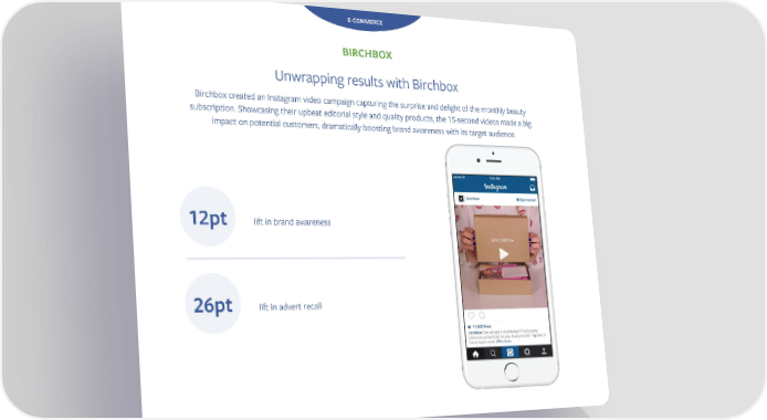 E-COMMERCE Unwrapping results with Birchbox Birchbox created an Instagram video campaign capturing the surprise and delight of the monthly beauty subscription. Showcasing their upbeat editorial style and quality products, the 15-second videos made a big impact on potential customers, dramatically boosting brand awareness with its target audience. 12pt lift in brand awareness 26pt lift in advert recall