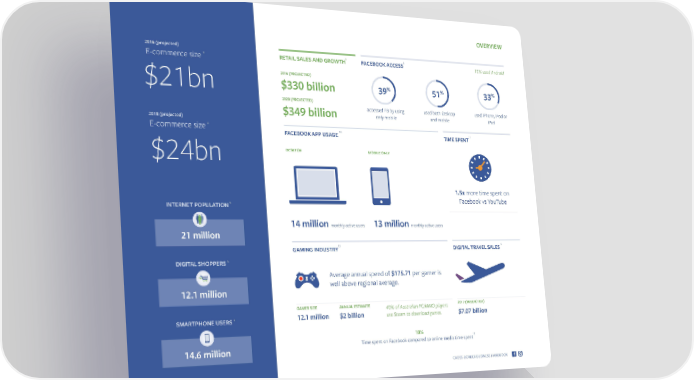 OVERVIEW 2016 (projected) 8 3 E-commerce size 8 RETAIL SALES AND GROWTH FACEBOOK ACCESS 15% used Android 2016 (PROJECTED) % % % $21bn $330 billion 39 51 33 2020 (PROJECTED) accessed FB by using used both desktop used iPhone, iPod or $349 billion only mobile and mobile iPad 2018 (projected) 8 E-commerce size 10 11 FACEBOOK APP USAGE TIME SPENT $24bn DESKTOP MOBILE ONLY 1.5x more time spent on Facebook vs YouTube 9 INTERNET POPULATION 14 million monthly active users 13 million monthly active users 21 million 12 8 GAMING INDUSTRY DIGITAL TRAVEL SALES 8 DIGITAL SHOPPERS Average annual spend of $175.71 per gamer is 12.1 million well above regional average. GAMER SIZE ANNUAL ESTIMATE 40% of Australian PC/MMO players 2017 (PREDICTED) 9 12.1 million $2 billion use Steam to download games. $7.07 billion SMARTPHONE USERS 18% 13 14.6 million Time spent on Facebook compared to online media time spent CROSS-BORDER BUSINESS HANDBOOK