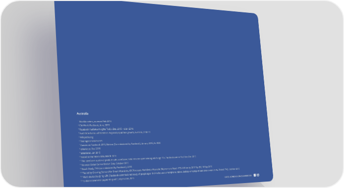 Australia 1 Worldometers, accessed Feb 2016 2 CIA World Factbook, June, 2015 3 Facebook Audience Insights Tool, 6 Dec 2015 – 6 Jan 2016 4 Australian Bureau of Statistics: Regional population growth, Australia, 2010-11 5 Wikipedia.org 6 Tradingeconomics.com 7 Aussies on Facebook 2015, Nielsen (Commissioned by Facebook), January 2015, N=1000 8 eMarketer, Dec 2015 9 eMarketer, Jun 2015 10 Based on Facebook data, March 2016 11 The comScore audience product suite, comScore, total minutes spent among adults age 15+, Facebook.com vs YouTube, Dec 2015 12 Newzoo Global Games Market Data, October 2015 13 Reach Study, TNS (commissioned by Facebook), 2015 14 "Fueled by Growing Demand for Smart Wearables, IDC Forecasts Worldwide Wearable Shipments to Reach 173.4 Million by 2019" by IDC, 14 Sep 2015 15 "Multi-device Study" by GfK (Facebook-commissioned study of people ages 18-54 who use a smartphone, tablet, desktop or laptop at least once a week in AU, TH and TW), Oct-Nov 2015 16 "Global-ecommerce-payments-guide", Adyen.com, 2015 CRCROSOSSS-BORDER BUSINES-BORDER BUSINESS HANDBOOKS HANDBOOK