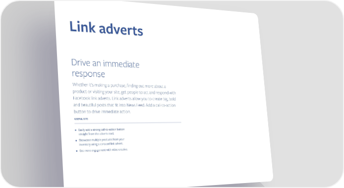Link adverts Drive an immediate response Whether it's making a purchase, finding out more about a product or visiting your site, get people to act and respond with Facebook link adverts. Link adverts allow you to create big, bold and beautiful posts that fit into News Feed. Add a call-to-action button to drive immediate action. USEFUL BITS • Easily add a strong call-to-action button straight from the adverts tool. • Showcase multiple products from your inventory using a carousel link advert. • Get more engagement with video creative.