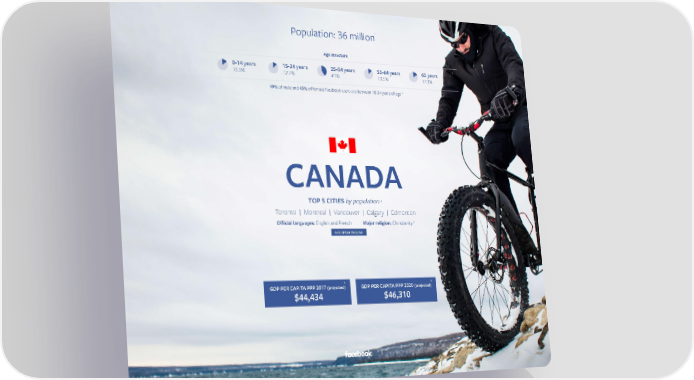 Population: 36 million1 Age structure 0-14 years 15-24 years 25-54 years 55-64 years 65 years 2 15.5% 12.7% 41% 13.5% 17.3% 3 49% of male and 43% of female Facebook users are between 18-34 years of age CANADA TOP 5 CITIES by population 4 Toronto | Montreal | Vancouver | Calgary | Edmonton 5 Official languages: English and French Major religion: Christianity 85% SPEAK ENGLISH 6 6 GDP PER CAPITA PPP 2017 (projected) GDP PER CAPITA PPP 2020 (projected) $44,434 $46,310