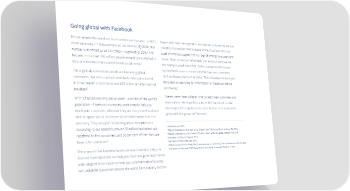 Going global with Facebook People around the world are more connected than ever. In 2012, begins with basic demographic information, followed by notable there were only 2.7 billion people on the Internet. By 2018, that industry information that includes various business sizes, the 1 scale of online shoppers, the number of smartphone users and number is expected to be 3.82 billion – a growth of 30%. And last year, more than 900 million people around the world had at more. Then, consumer behaviours on Facebook are covered. 2 For example, you'll learn that the top categories discovered least one international connection on social media. These globally connected people are becoming global by Facebook users in France are entertainment, cosmetics, 6 consumers. 361 million people worldwide have participated tech and luxury fashion. And that 70% of Malaysians surveyed in cross-border e-commerce and 429 million are international have seen or searched for information on Facebook before 7 3 purchasing. travellers. 4 There's never been a better time to reach new customers and With 1.7 billion monthly active users – one-fifth of the world's new markets. We hope that you use this handbook to take population – Facebook is uniquely positioned to help you advantage of the opportunities your business has around the reach your customers, wherever they are. People on Facebook globe with the power of Facebook. and Instagram are at the centre of personal connection and discovery. They are open to learning about new products. 1 According to our research, around 50 million businesses use eMarketer Apr 2016 2 "Digital Globalization, The New Era of Global Flows", McKinsey Global Institute, Feb 2016 3 Facebook to find customers, and 30 per cent of their fans are "Digital Globalization, The New Era of Global Flows", McKinsey Global Institute, Feb 2016 4 5 Facebook 1st Quarter Report, 2016 from other countries. 5 Facebook Internal Data, Dec 2015 6 EMEA Country Profile Study, GfK (Commissioned by Facebook), France, December 2015, N=1000 7 This cross-border business handbook was created to help you Malaysian on Facebook, TNS Study (Commissioned by Facebook), 2014. N = 1069 discover how Facebook can help your business grow. You'll find a wide range of information to help you communicate effectively with potential customers around the world. Each country section