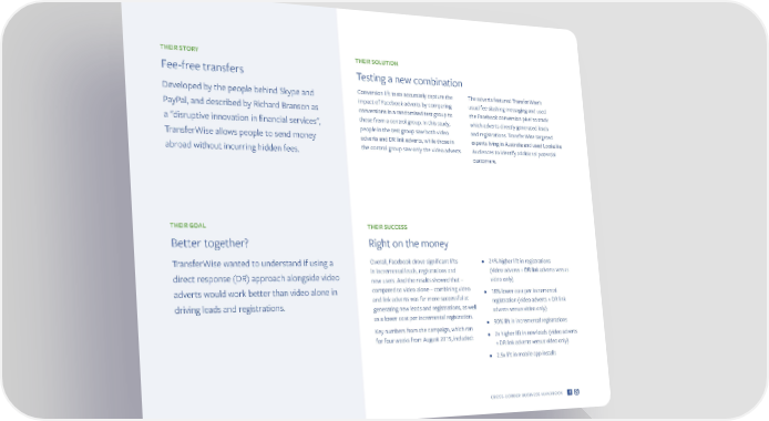 THEIR STORY THEIR SOLUTION Fee-free transfers Testing a new combination Developed by the people behind Skype and Conversion lift tests accurately capture the The adverts featured TransferWise's impact of Facebook adverts by comparing usual fee-slashing messaging and used PayPal, and described by Richard Branson as conversions in a randomised test group to the Facebook conversion pixel to track a "disruptive innovation in financial services", those from a control group. In this study, which adverts directly generated leads people in the test group saw both video and registrations. TransferWise targeted TransferWise allows people to send money adverts and DR link adverts, while those in experts living in Australia and used Lookalike abroad without incurring hidden fees. the control group saw only the video adverts. Audiences to identify additional potential customers. THEIR GOAL THEIR SUCCESS Better together? Right on the money TransferWise wanted to understand if using a Overall, Facebook drove significant lifts • 24% higher lift in registrations direct response (DR) approach alongside video in incremental leads, registrations and (video adverts + DR link adverts versus new users. And the results showed that – video only) adverts would work better than video alone in compared to video alone – combining video • 18% lower cost per incremental driving leads and registrations. and link adverts was far more successful at registration (video adverts + DR link generating new leads and registrations, as well adverts versus video only) as a lower cost per incremental registration. • 90% lift in incremental registrations Key numbers from the campaign, which ran • 2x higher lift in new leads (video adverts for four weeks from August 2015, included: +DR link adverts versus video only) • 2.5x lift in mobile app installs CROSS-BORDER BUSINESS HANDBOOK