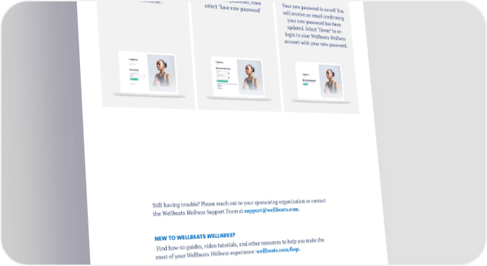 7 8 9 Enter your code in the box and Enter a new password, then Your new password is saved! You select ‘Continue’. select ‘Save new password’ will receive an email con昀椀rming your new password has been updated. Select ‘Home’ to re- login to your Wellbeats Wellness account with your new password. Still having trouble? Please reach out to your sponsoring organization or contact the Wellbeats Wellness Support Team at support@wellbeats.com. NEW TO WELLBEATS WELLNESS? Find how-to guides, video tutorials, and other resources to help you make the most of your Wellbeats Wellness experience: wellbeats.com/faqs.