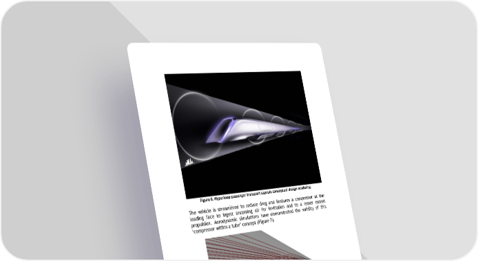 Figure 6. Hyperloop passenger transport capsule conceptual design rendering. The vehicle is streamlined to reduce drag and features a compressor at the leading face to ingest oncoming air for levitation and to a lesser extent propulsion. Aerodynamic simulations have demonstrated the validity of this ‘compressor within a tube’ concept (Figure 7). Figure 7. Streamlines for capsule traveling at high subsonic velocities inside Hyperloop.