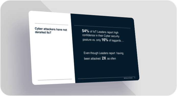 Cyber attackers have not 54% of IoT Leaders report high derailed IIoT confidence in their Cyber security posture vs. only 16% of laggards…. Even though Leaders report having been attacked 2X as often McKinsey & Company 31