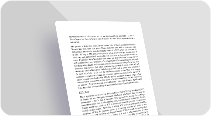 the monetary store of value crown, we can and should update our assessment. So far, as Bitcoin’s price has risen, so have its odds of success. For now, Bitcoin appears to remain a rational bet. The question of forks often comes up and whether forks of Bitcoin undermine its scarcity. Because they share same hash power, Bitcoin forks will either need to demonstrate some differentiated and valuable niche functionality compared to BTC, or they will wither and die in time. As long as BTC continues to perform well as a non-sovereign, monetary store of value, any such differentiated functionality will likely need to focus on less valuable use cases. It’s possible that a Bitcoin fork finds such a non-store-of-value use case and survives with some relatively low, sustainable value reflecting the niche functionality it has addressed. It’s also possible that the market assigns some fractional value for some period of time to an alternative store-of-value fork either irrationally (an ideological schism occurs and self- sustains for a little while) or as a kind of ace-in-the-hole back-up against some corruption of the main blockchain. In the end, the equilibrium outcome is more likely to be a single, dominant, monetary store of value, and it currently appears more likely that that will be BTC. For an investor who already owns BTC, the prudent investment strategy is simply to hold onto any forked versions that credibly appear to have a sustainable use case and value as they are received. For a new investor, it probably doesn’t make sense allocating capital to prior forks due to their lower probability of success and their relatively niche potential value. BTC v BCH This is a good juncture to touch on the recent Bitcoin Cash (BCH) fork from Bitcoin (BTC) in August and the subsequent community ideological split behind them following the abandonment of the 2x fork in November. BTC appears to be focusing first on being a censorship-resistant store of value and improving its scalability over the long term, foremost through second-layer solutions; BCH is focused on immediate payments competitiveness through on-chain scaling. At the time of writing, BCH is cheaper for payments than BTC, acceptance of BCH for payments appears to be growing, and there are doubts in some quarters about both the timing and degree of success of BTC’s second-layer scaling efforts. On the other hand, BCH is seen as weaker as a store of value and to have a weaker development team. BCH would just be another alt-coin as far as BTC is concerned but for (a) potential user confusion due to the similarity of the names and the ownership of the domain bitcoin.com by one of BCH’s promoters, who actively claims that BCH is the ‘true Bitcoin’; (b) the fact that BCH and BTC share and compete for the same hash power; and (c) the fact that BCH is being promoted by individuals with significant BTC holdings, who run large exchanges and wallet companies and hold sway over a significant amount (maybe more than 50% collectively) of hash power. Factor (b) raises the concern that, because BTC’s difficulty adjustment is fortnightly while BCH’s is daily, a significant increase in the price of BCH relative to BTC would cause hash power to swing away from BTC to BCH, slowing or halting BTC block times until the next BTC difficulty adjustment.33 Factor (c) means that BCH’s main backers may try to attack BTC by various means with a non-zero probability of success. This blog post and this blog post go into scenarios in which the price of BCH could increase in the short run relative to the price of BTC. In a nutshell, if such price swings are temporary, so should be the disruption caused by them, and as a store of value BTC is less sensitive (store-of-value use implies generally larger, less time-sensitive transactions) to this kind of short term disruption than BCH is as a means of payment (generally smaller, time-sensitive 33 You can follow the swings in hashrate between BTC and BCH here. 21