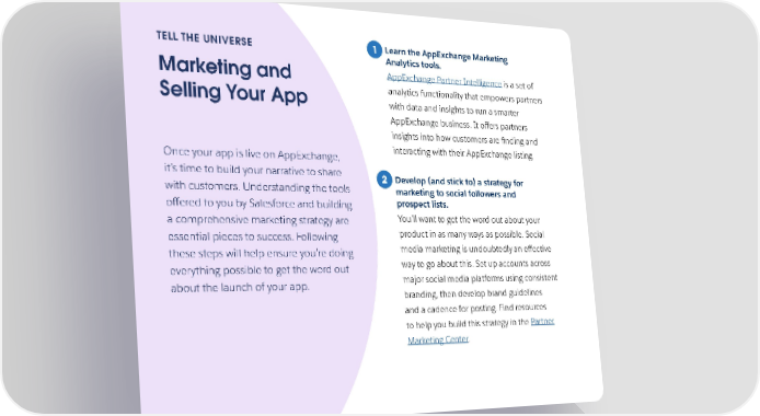 TELL THE UNIVERSE 1. Learn the AppExchange Marketing Analytics tools. Marketing and AppExchange Partner Intelligence is a set of Selling Your App analytics functionality that empowers partners with data and insights to run a smarter AppExchange business. It offers partners insights into how customers are finding and Once your app is live on AppExchange, interacting with their AppExchange listing. it’s time to build your narrative to share 2. Develop (and stick to) a strategy for with customers. Understanding the tools marketing to social followers and offered to you by Salesforce and building prospect lists. a comprehensive marketing strategy are You’ll want to get the word out about your essential pieces to success. Following product in as many ways as possible. Social these steps will help ensure you’re doing media marketing is undoubtedly an effective everything possible to get the word out way to go about this. Set up accounts across about the launch of your app. major social media platforms using consistent branding, then develop brand guidelines and a cadence for posting. Find resources to help you build this strategy in the Partner Marketing Center.