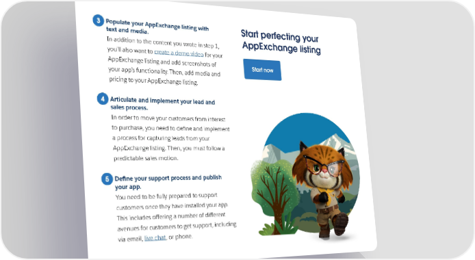 1. Populate your AppExchange listing with Start perfecting your text and media. AppExchange listing In addition to the content you wrote in step 1, you’ll also want to create a demo video for your AppExchange listing and add screenshots of Start now your app’s functionality. Then, add media and pricing to your AppExchange listing. 2. Articulate and implement your lead and sales process. In order to move your customers from interest to purchase, you need to define and implement a process for capturing leads from your AppExchange listing. Then, you must follow a predictable sales motion. 3. Define your support process and publish your app. You need to be fully prepared to support customers once they have installed your app. This includes offering a number of different avenues for customers to get support, including via email, live chat, or phone.
